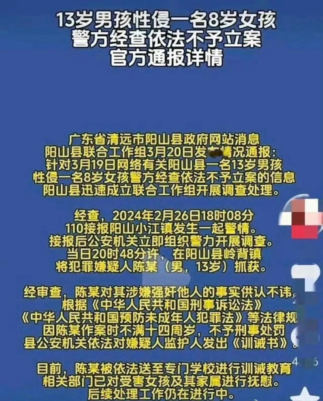 门槛最低的精,大概就是杠精了,狐狸精至少要外貌、人精至少还要点小聪明,杠精又称为反驳型人格,但有的人把反驳型人格当作PUA别人的工具,只要你反对他的观点,他就说你是反驳型人格,你辩解说我不是,他就会说你看我就说你是吧,你要是不吭声,他就会说你看默认了吧;你还别说,这工具还真好用。 13岁男生不满14岁,根据预防未成年人犯罪法,他在性侵他人时可以不用刑事处罚,出个训诫书,接受个训诫教育就完事了。年龄小就是免死金牌吗? 八岁女孩也是未成年人啊,又有谁来保护她? 找了找新闻,不仅不立案,小畜生都已经返校上课了。所以说现在的立案和量刑准则都需要更新了,该保护的保护不了,该严惩的惩罚不了 再说这个案子,既然惩罚不了小畜生,那它的监护人它的家长总得出来替它担责吧,怎么就不了了之了?犯罪成本也太低了。