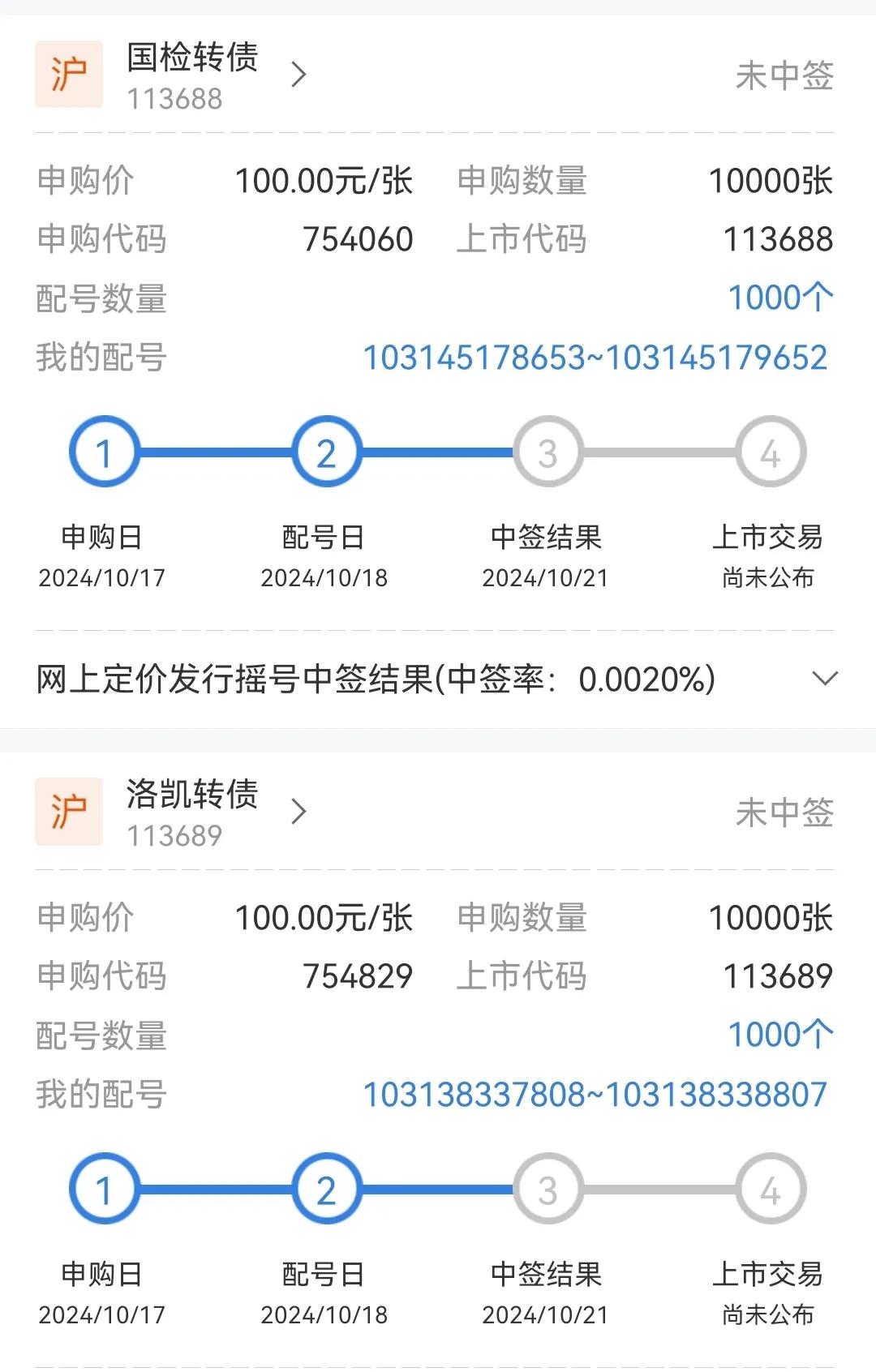 盲盒已开,你中奖了吗? 上周四,申购国检新债和洛凯转债。大多数交易软件在周五会显示中签与否,预中签的就是中签,同时会收到短信通知。中签者一定切记,明天(周一)16点前记得足额缴款,否则“黄牌”警告。 很可惜,这次我的运气差一点,一签未得。 恭喜中签的朋友,目前看一签至少200元收益。记得有位朋友有1.2.3.4.5----50个账户,必定收获不小。 单单可转债打新,这点“蝇头小利”,也有大佬玩的精彩纷呈。 2022年单账户打新,平均收益1000元,50个账户总计5万元。 2023年单账户打新,平均收益500元,50个账户总计2.5万元。 可转债打新,公平公正,全凭运气,而且风险低,收益率高,绝对是小白投资者最友好的投资方式。 祝你中签,好运常在。#希望这次能中签# #恭喜中签朋友们#