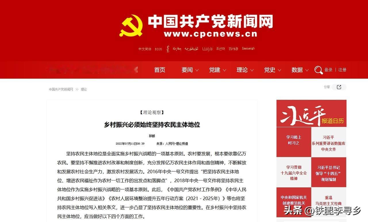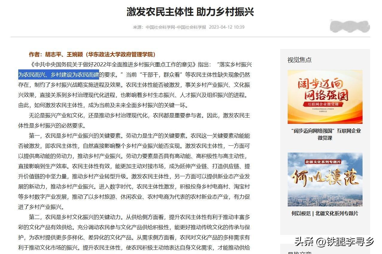 农业是根本,农民是什么呢? “农民是三农的核心与主体”——这是我们自乡村振兴战略确立以来一以贯之的重要原则!2021年6月颁布实施的《乡村振兴促进法》第四条、第十二条、第五十六条均非常明确地强化了这一根本思想,历次高层会议也都三番五次地反复强调这一点。 只要贯彻了以农民为主体的核心思想,农业的发展与农村的兴旺自然水到渠成,反之,如果搞错了核心问题,漠视核心问题,即使农业得到发展,也会落得乡村凋敝,充其量只是一个巨大的农产品车间而已!