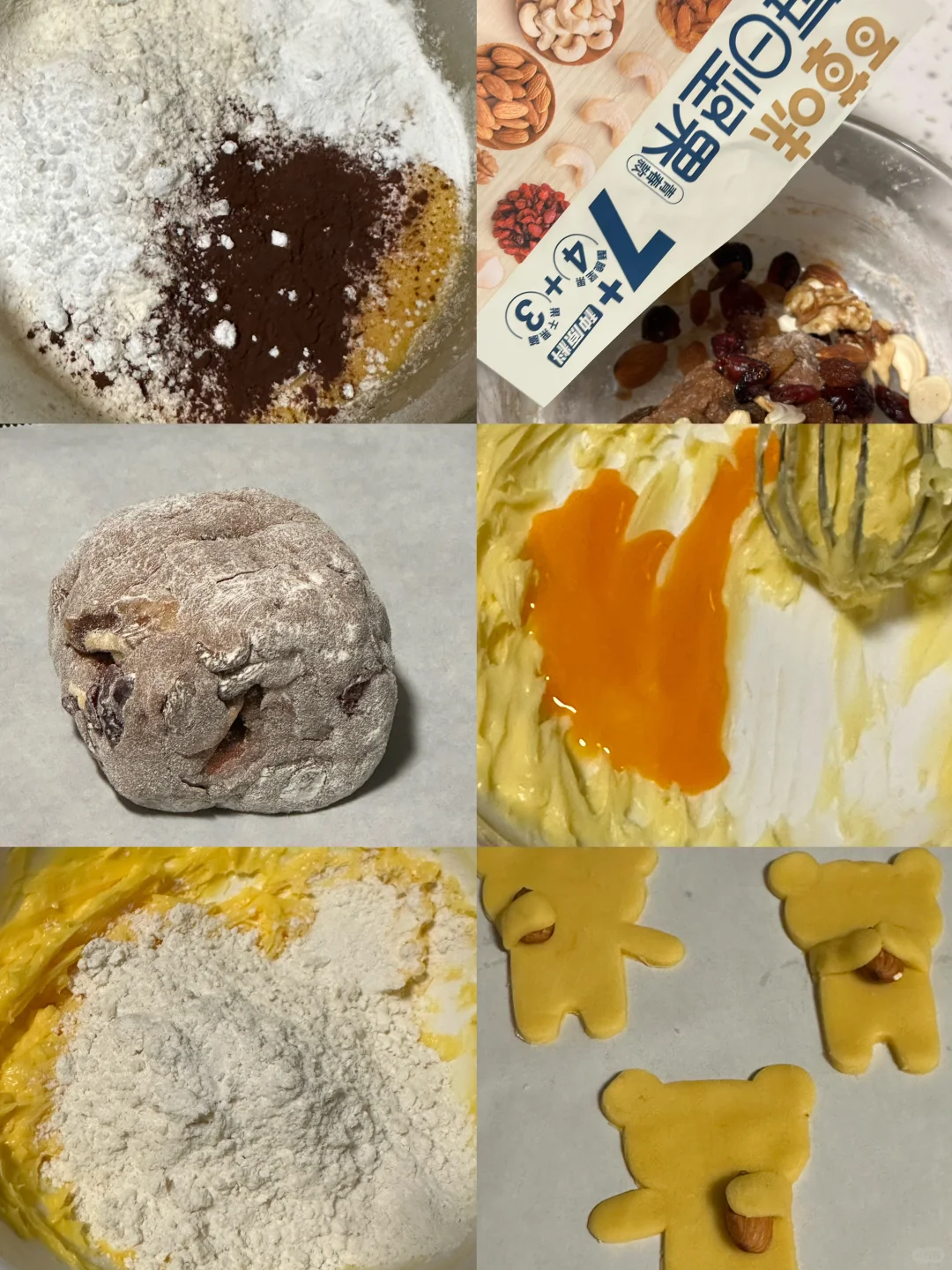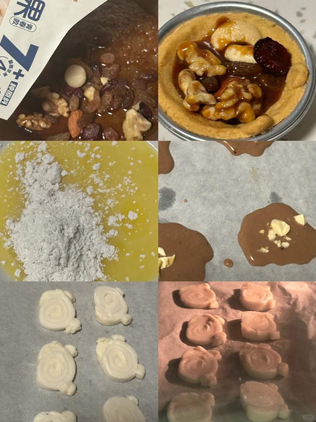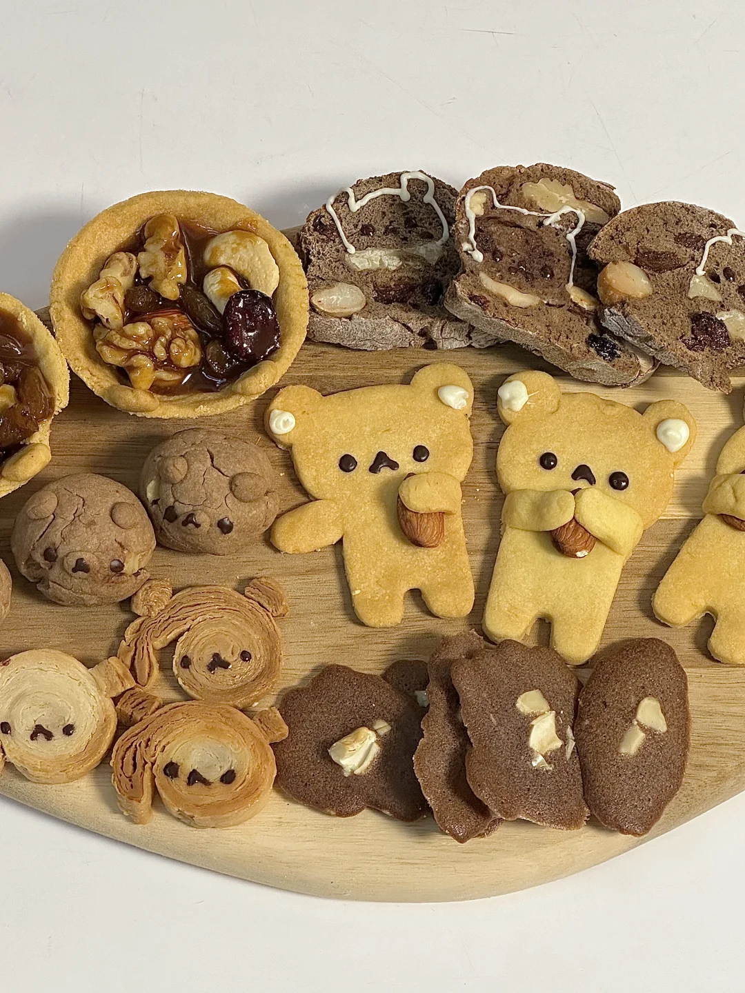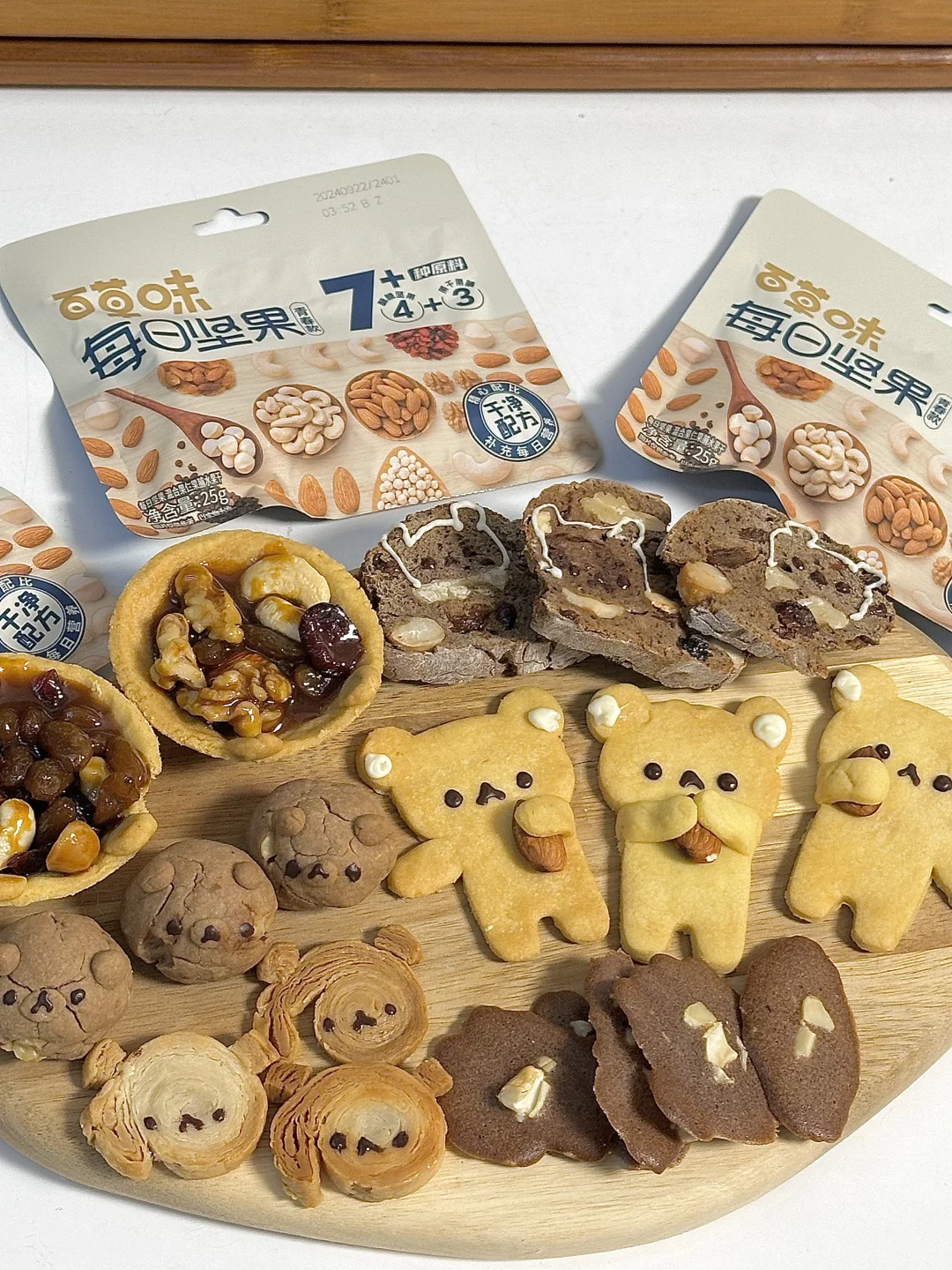 嘿嘿宅家能吃上这么可爱的饼干们谁不迷糊! 配料: 曲奇面团(坚果塔塔壳、抱抱熊曲奇、核桃雪球):38g黄油、12g糖粉、10g蛋黄、70g低粉、可可粉(仅核桃雪球部分添加) 坚果塔馅料:焦糖酱、每日坚果 意式脆饼:46g蛋液、65g低筋面粉、1g可可粉、2泡打粉、5g糖粉、2包每日坚果 可可腰果薄脆:30g蛋清、10g黄油、10g糖粉、10g低粉、1小勺可可粉 (今天用到的坚果都是百草味每日坚果4坚果+3果干礼盒~果干的酸甜混合着果干的香脆,根本停不下来,满满营养作为日常补充太适合不过!阶梯控温工艺结合全球严选原料提供好味的同时最大程度保留营养。 我是在淘宝买,搜索密令词“淘味宝藏美食”进入活动主页,就可以更划算购入啦!我还买了弘一紫米面包作为早餐~一口下去外软内糯,饱满的紫米混合着香浓的蛋香被清新的麦香包裹,太好吃啦!嘿嘿我还在活动页面买了夜宵,好欢螺家的螺狮粉也有活动!双倍的腐竹和增量酸笋简直不要太满足!魔鬼的辅助让滋味更上一层楼~) 1.曲奇面团里的黄油提前软化加入糖粉打发,再加入蛋黄二次打发,然后加入面粉混合成团,取1/3加入可可粉与核桃碎,原色面团分别压出小熊形状(抱一颗坚果)和放入塔壳模具中,可可色搓成小球再沾上小熊耳朵,入烤箱150度考18分钟 2.焦糖酱在锅中煮至出现大泡泡,关火加入每日坚果拌匀后放入烤好的塔壳中 3.意式脆饼的蛋液打散后加入剩下的所有粉类,再拌入每日坚果,混合至无干粉状态后再烘焙纸上整成团,180度烤20分钟,然后冷却后切片,150度烤18分钟 4.可可腰果薄脆的蛋清加入融化的黄油,混合均匀后加入剩下所有的配料拌匀,装入裱花袋,挤在烘焙纸上撒上腰果碎,150度烤15分钟 5.融化的巧克力画表情