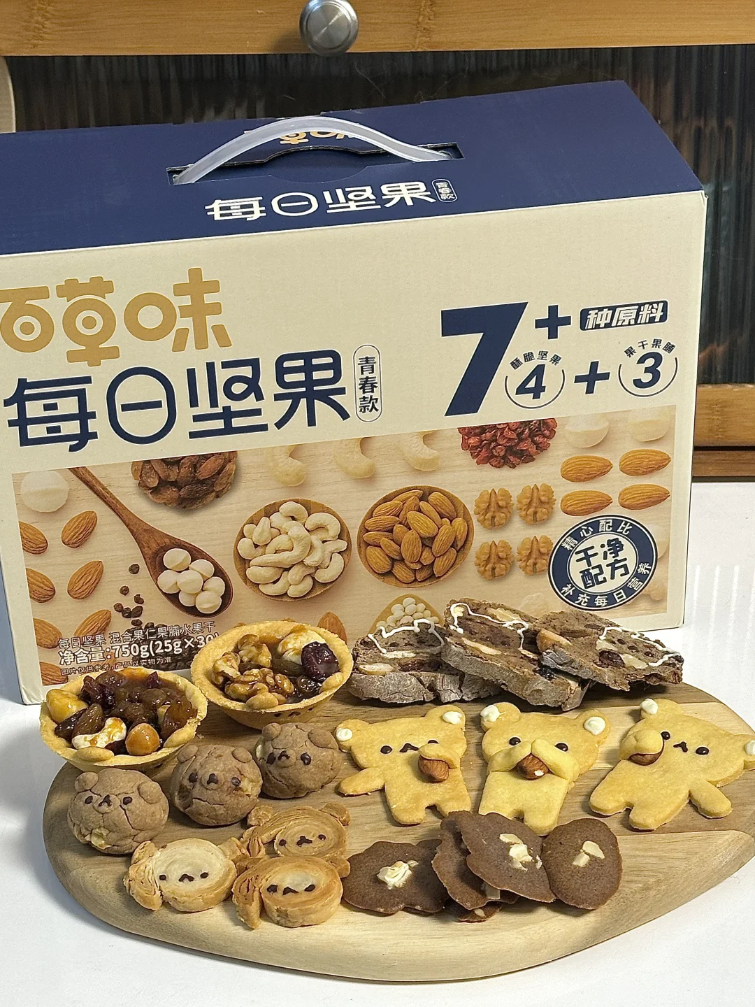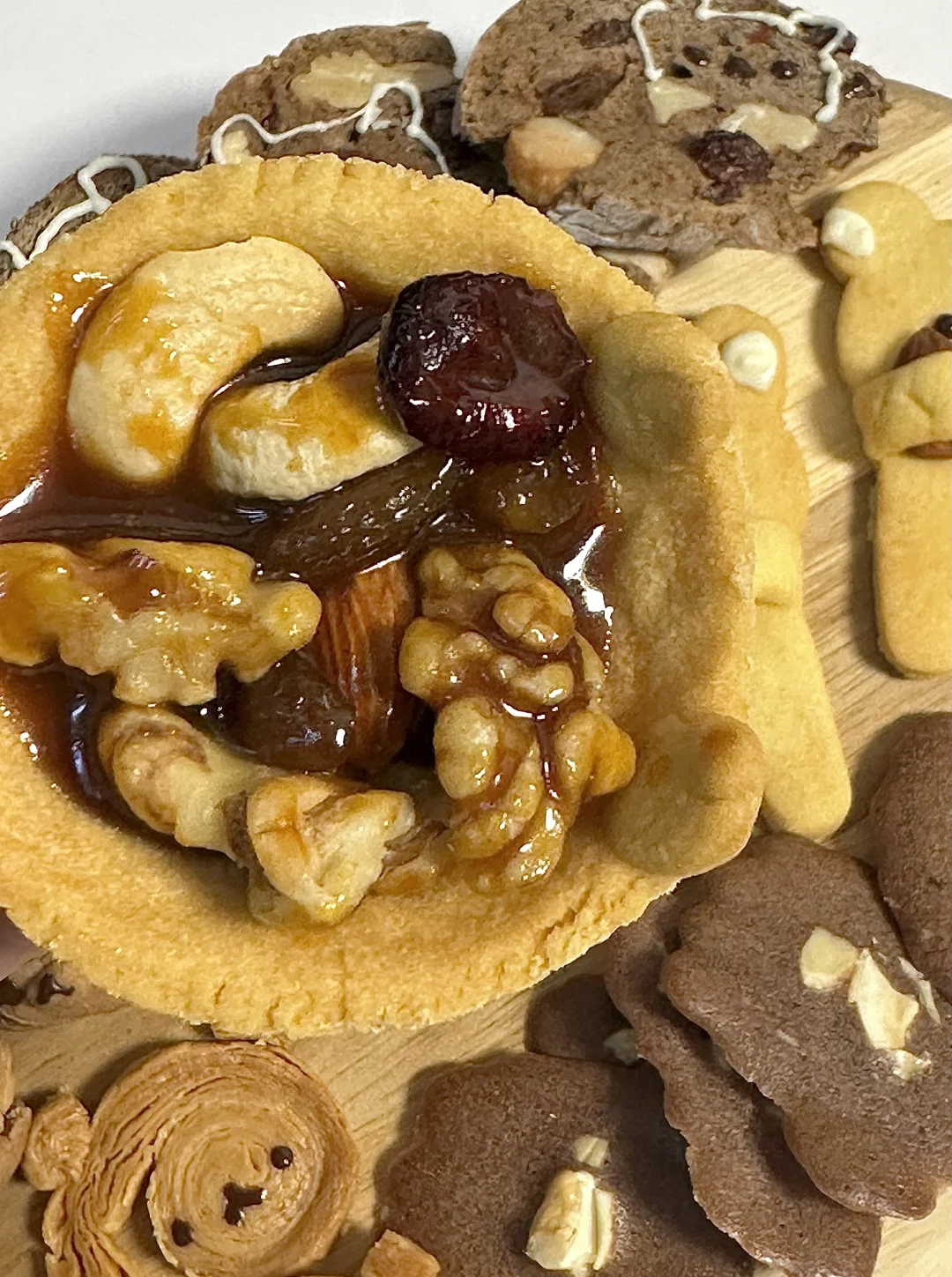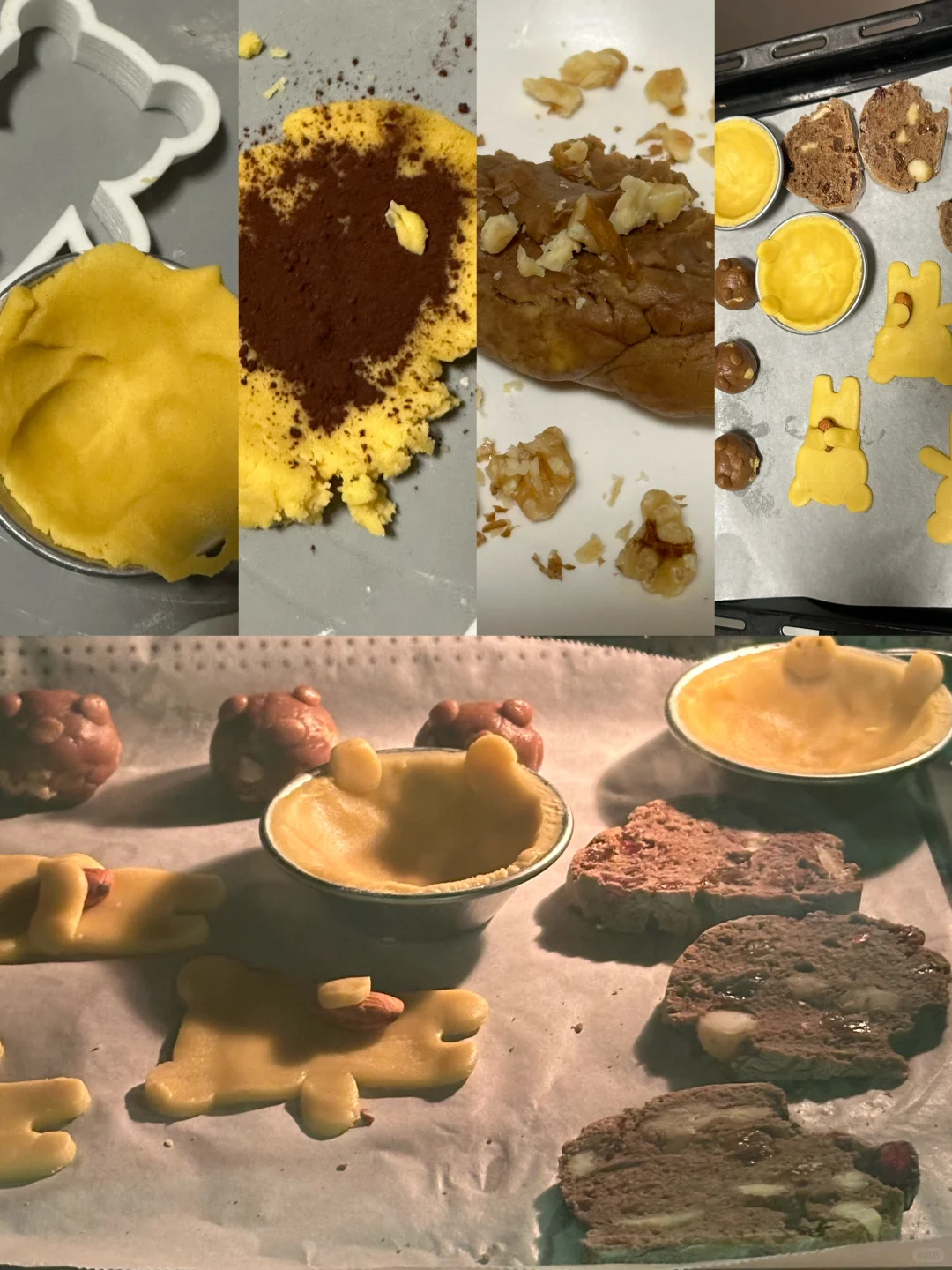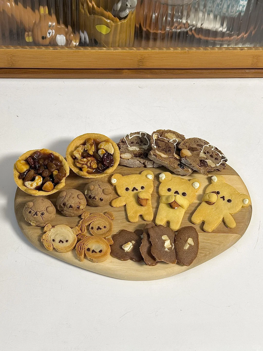 嘿嘿宅家能吃上这么可爱的饼干们谁不迷糊! 配料: 曲奇面团(坚果塔塔壳、抱抱熊曲奇、核桃雪球):38g黄油、12g糖粉、10g蛋黄、70g低粉、可可粉(仅核桃雪球部分添加) 坚果塔馅料:焦糖酱、每日坚果 意式脆饼:46g蛋液、65g低筋面粉、1g可可粉、2泡打粉、5g糖粉、2包每日坚果 可可腰果薄脆:30g蛋清、10g黄油、10g糖粉、10g低粉、1小勺可可粉 (今天用到的坚果都是百草味每日坚果4坚果+3果干礼盒~果干的酸甜混合着果干的香脆,根本停不下来,满满营养作为日常补充太适合不过!阶梯控温工艺结合全球严选原料提供好味的同时最大程度保留营养。 我是在淘宝买,搜索密令词“淘味宝藏美食”进入活动主页,就可以更划算购入啦!我还买了弘一紫米面包作为早餐~一口下去外软内糯,饱满的紫米混合着香浓的蛋香被清新的麦香包裹,太好吃啦!嘿嘿我还在活动页面买了夜宵,好欢螺家的螺狮粉也有活动!双倍的腐竹和增量酸笋简直不要太满足!魔鬼的辅助让滋味更上一层楼~) 1.曲奇面团里的黄油提前软化加入糖粉打发,再加入蛋黄二次打发,然后加入面粉混合成团,取1/3加入可可粉与核桃碎,原色面团分别压出小熊形状(抱一颗坚果)和放入塔壳模具中,可可色搓成小球再沾上小熊耳朵,入烤箱150度考18分钟 2.焦糖酱在锅中煮至出现大泡泡,关火加入每日坚果拌匀后放入烤好的塔壳中 3.意式脆饼的蛋液打散后加入剩下的所有粉类,再拌入每日坚果,混合至无干粉状态后再烘焙纸上整成团,180度烤20分钟,然后冷却后切片,150度烤18分钟 4.可可腰果薄脆的蛋清加入融化的黄油,混合均匀后加入剩下所有的配料拌匀,装入裱花袋,挤在烘焙纸上撒上腰果碎,150度烤15分钟 5.融化的巧克力画表情