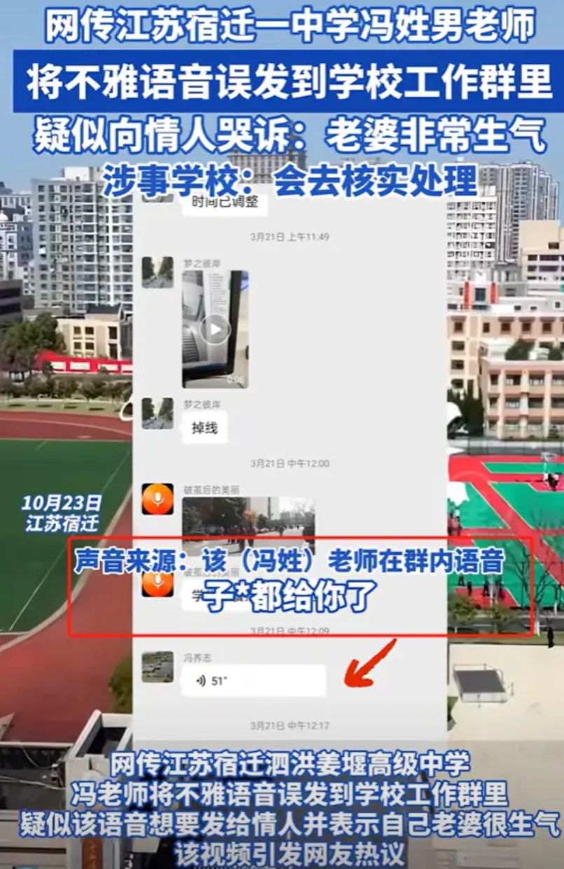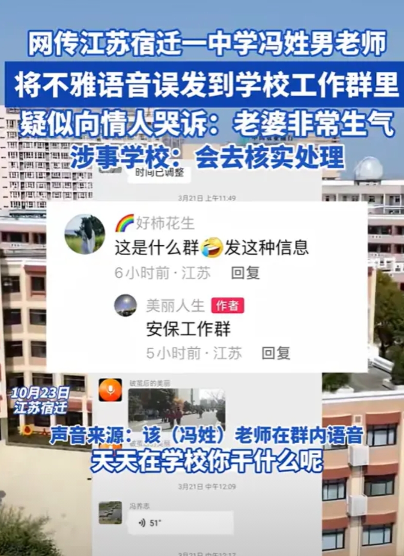 江苏宿迁,一中学男老师搞婚外情,把发给情人的不雅语音发工作群,哭诉“上周六J子都给你了,晚上我老婆想都Y不起来!”群里瞬间炸锅,却不确定是哪个冯姓老师发的,学校回应了!