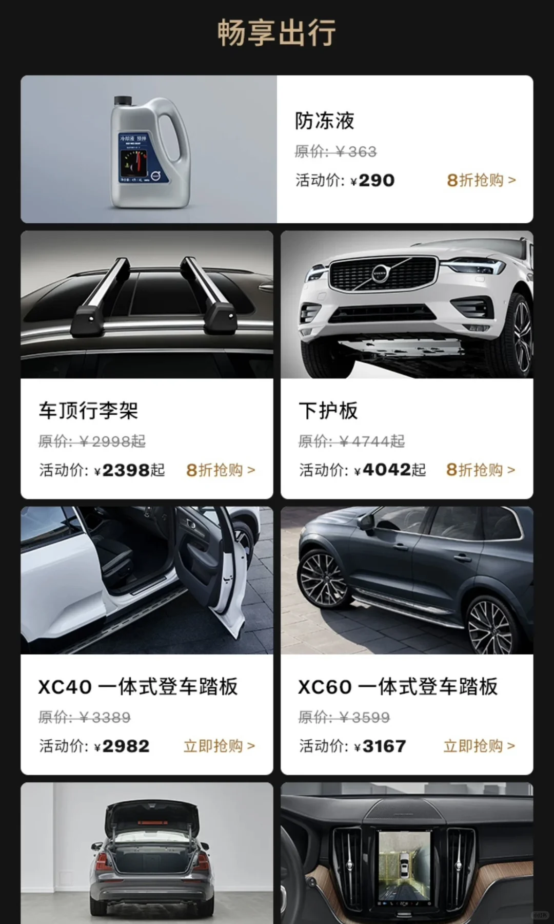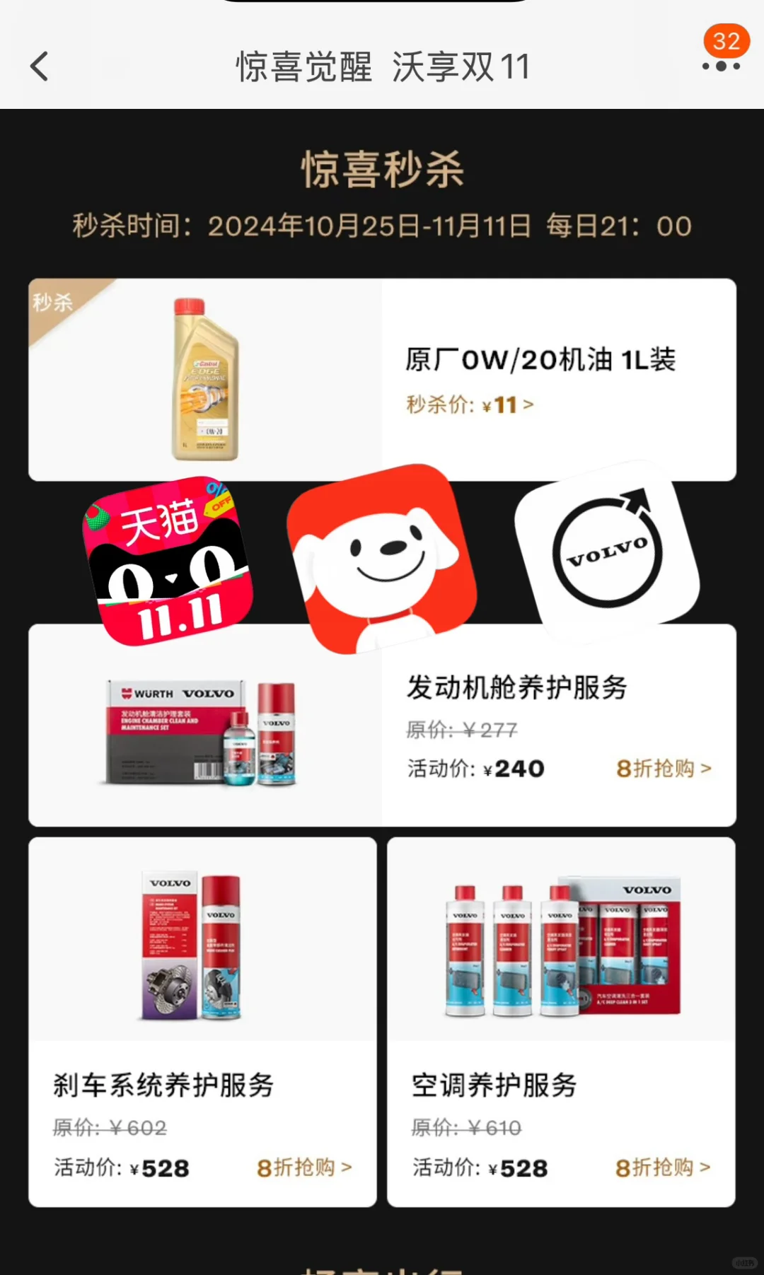 囤保养维修,蹲精品好物的宝子们 作业帮你们整理好了,直接抄 [打卡R]10月25日起 限时抢券:机油,防冻液养护类,行李架,下护板升级类,每天准时开抢,限量秒s 平台:沃尔沃汽车,阿猫,阿狗 ‼️抽2次基础保养,1年出险无忧服务 平台:阿猫直播间 [打卡R]11月1日起 三人开团,Polestar6500r券,快速清新剂5折优惠 集结好友共享超值优惠 平台:沃尔沃汽车