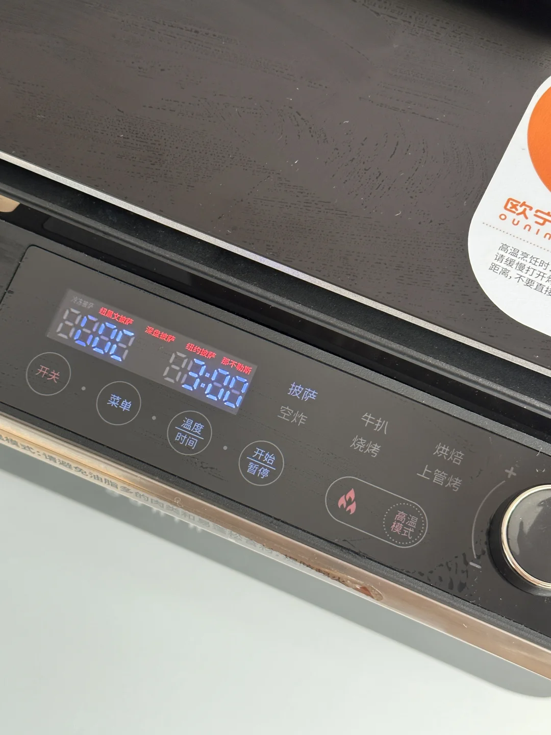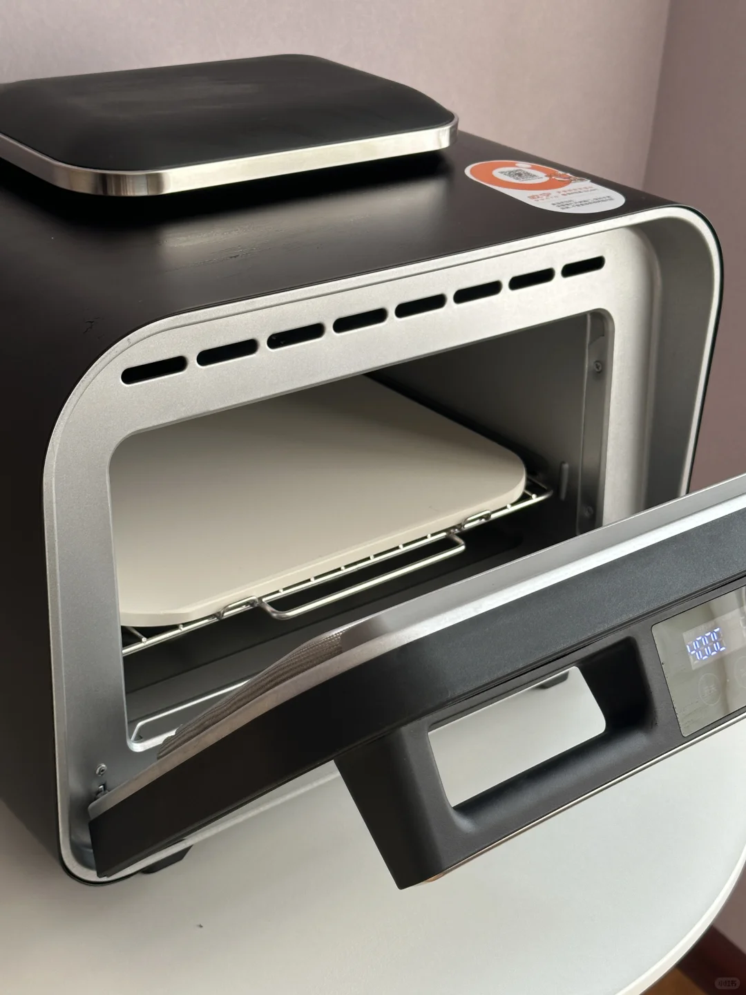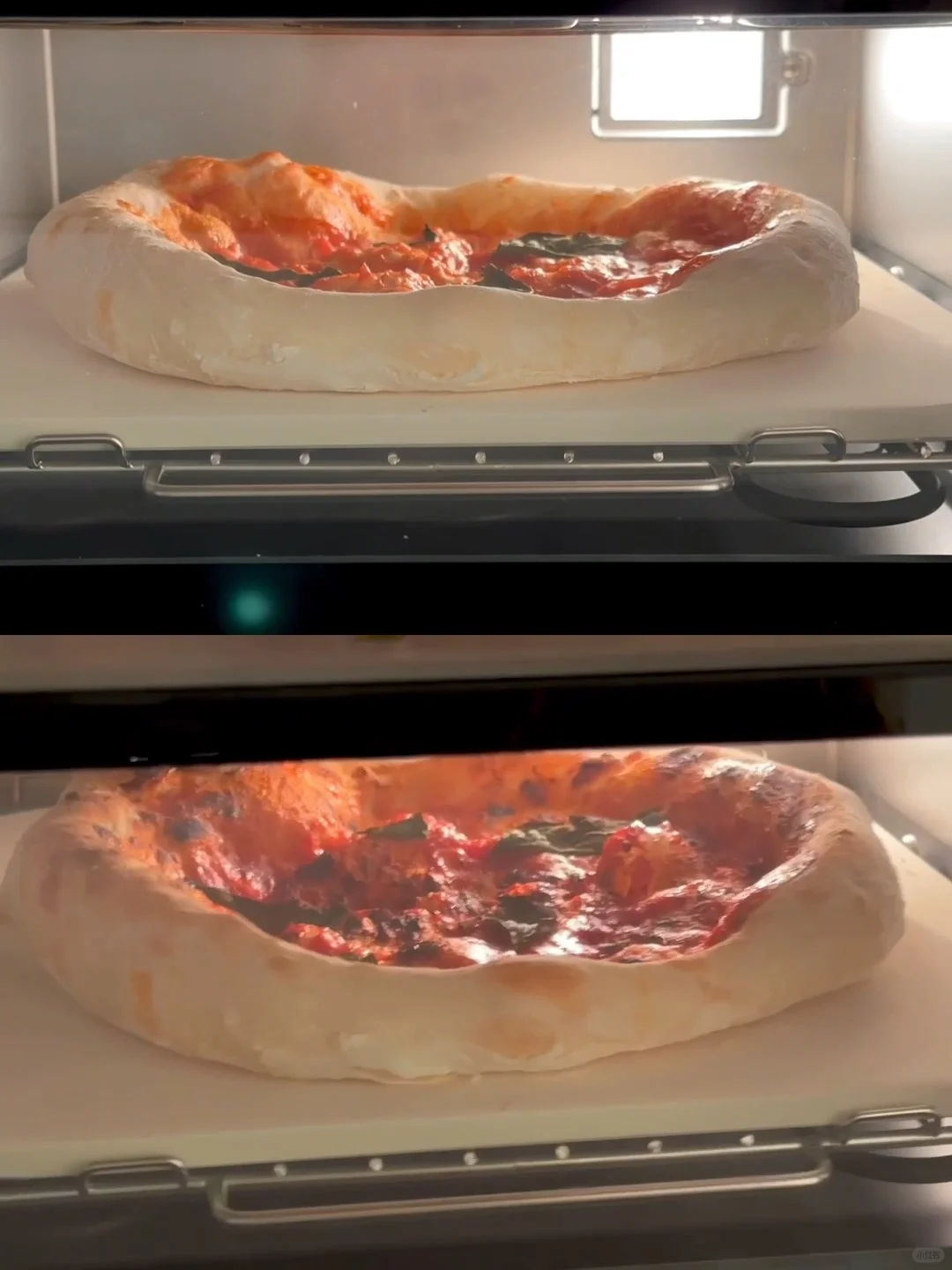 5️⃣欧宁披萨炉选择高温模式,放入陶瓷披萨石板,提前预热 400°,用披萨铲送入披萨