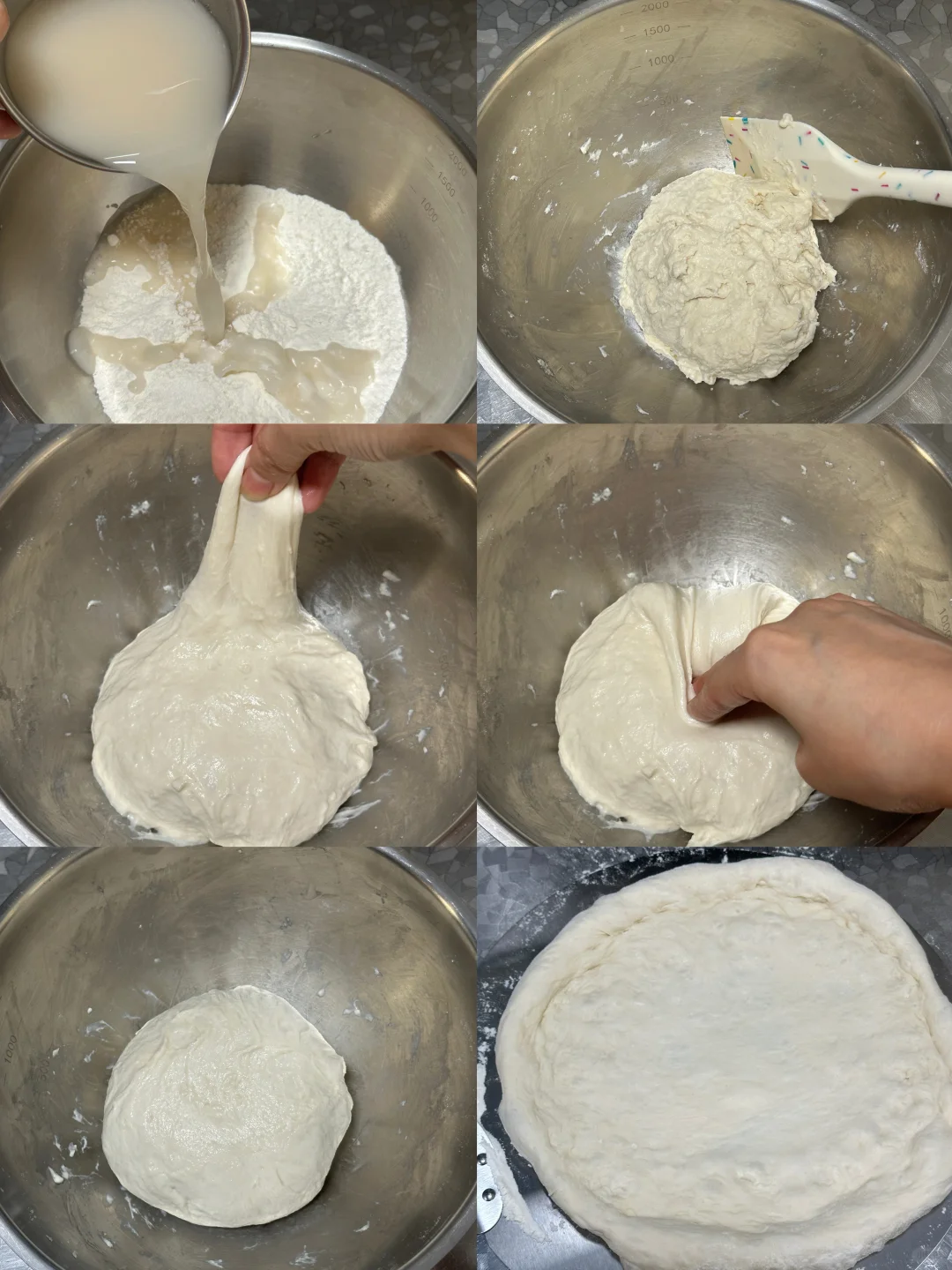 1️⃣酵母在水中化开,加入盐搅拌均匀,筛入高筋面粉,用刮刀翻拌至无千粉状态,盖保鲜膜松弛醒发20分钟