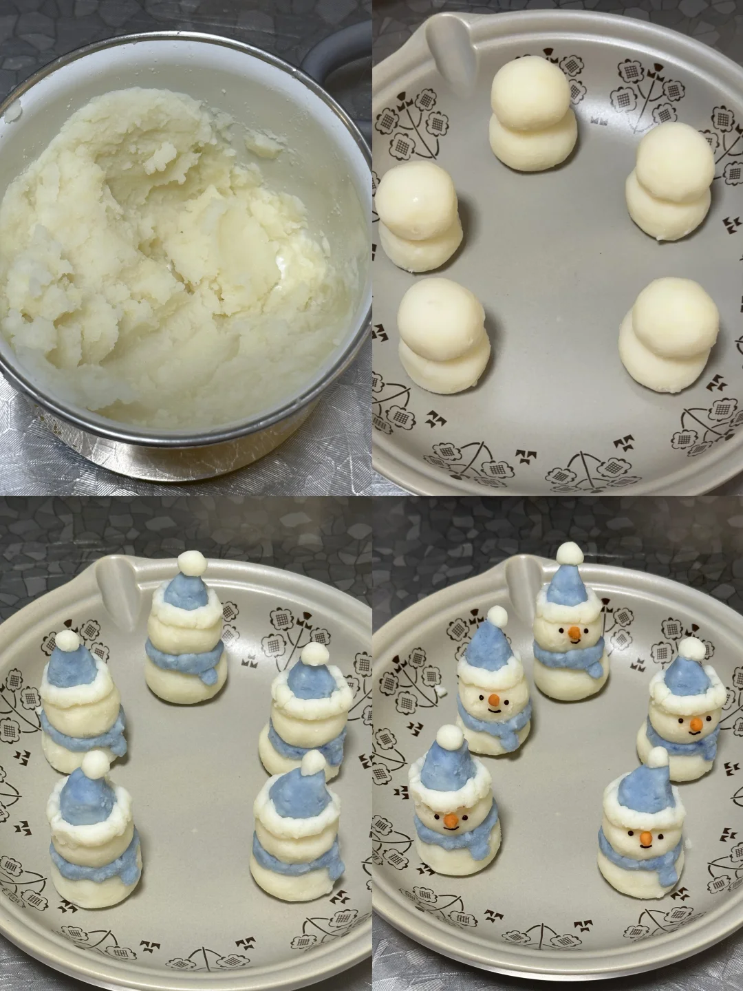 7️⃣出炉!摆放上以前做好的土豆泥小雪人。点缀新鲜罗勒叶(土豆泥蒸熟,加入黑椒海盐一丢丢黄油,压成泥,捏出小雪人形状,蓝色部分为蝶豆花分染色,橙色为甜椒粉上色,雪人手手是巧克力融化,画在油纸上凝固即可)