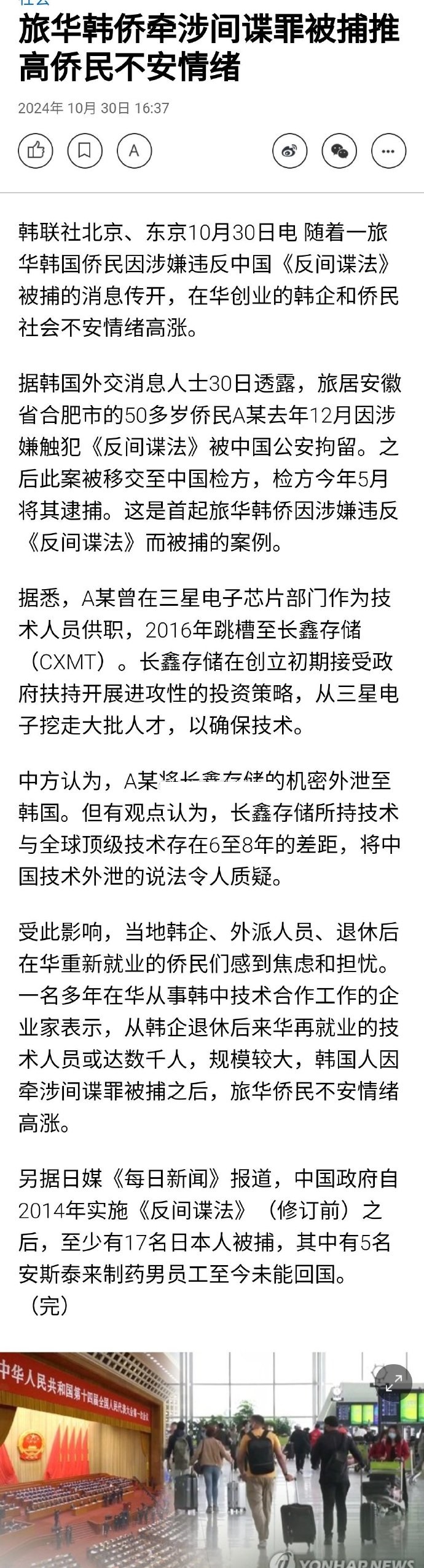 我们国内才报道呀。韩网上可是热议了好几天了。而且韩网民还在骂韩大使馆不作为,说之前就在传有人被捕,但驻华韩使馆一直否认这事。A某的家属妻子和女儿也都在合肥还说A某是被冤枉的,说他有糖尿病。