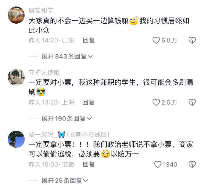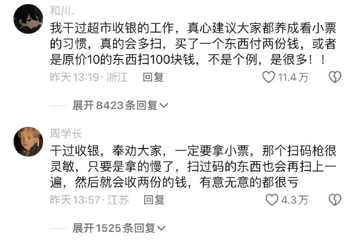 干过收银,奉劝大家,一定要拿小票,那个扫码枪很灵敏,只要是拿的慢了,扫过码的东西也会再扫上一遍,然后就会收两份的钱,有意无意的都很亏