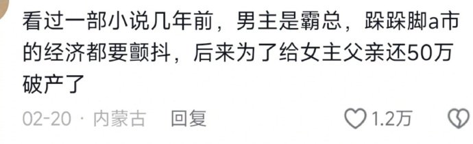 看过一部小说几年前,男主是霸总,跺跺脚a市的经济都要颤抖,后来为了给女主父亲还50万破产了