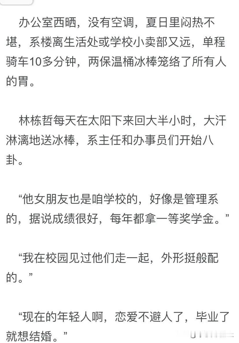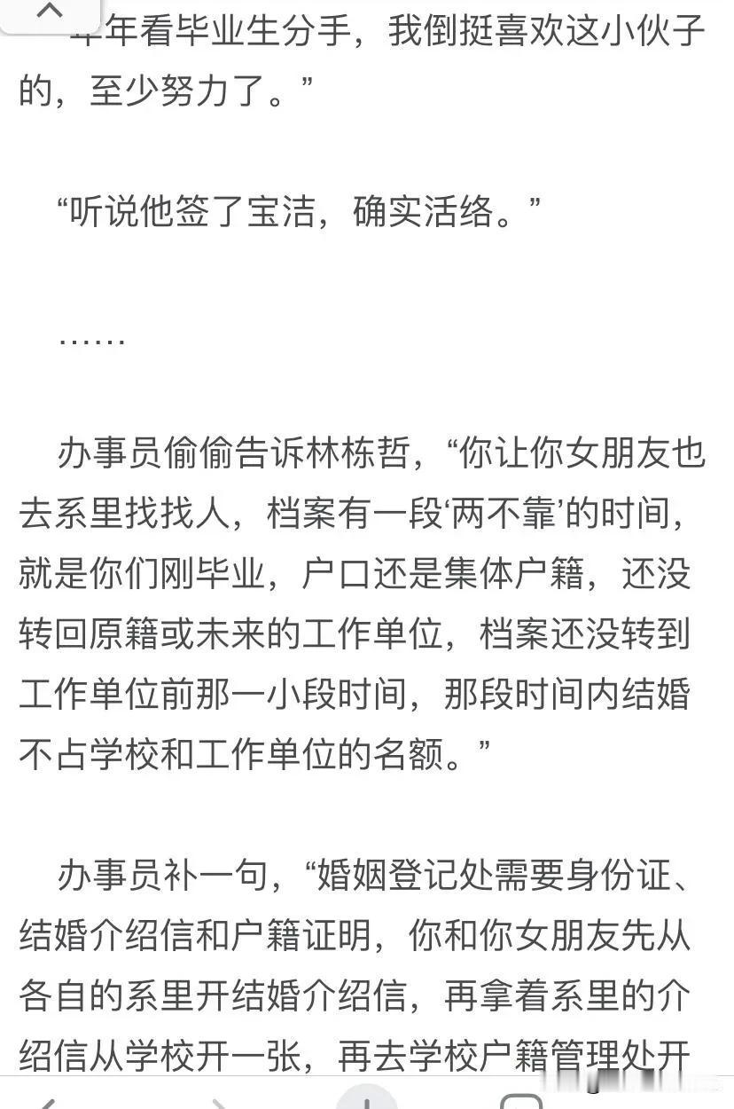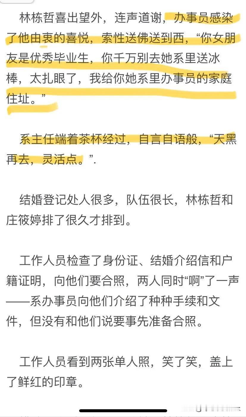 原著《小巷人家》林栋哲和庄筱婷结婚还有这么多波折呀!还好林栋哲都解决了[赞] 林栋哲执行力真的超强,毕业就想和筱婷结婚,马上结婚,所以他抓紧时间弄介绍信(那时候结婚还要介绍信,好正式呀!) 系里不给开,他就每天买两桶冰棒去打通关系,最后系主任主动给他支招去筱婷系里疏通关系[捂脸] 我收回之前那一句林武峰是巷子里最好的老公这句话,林栋哲长大了也是好男人,林家出好男人[大笑]