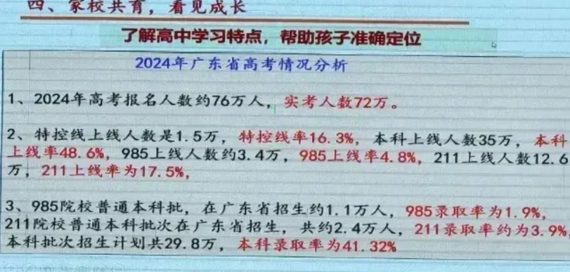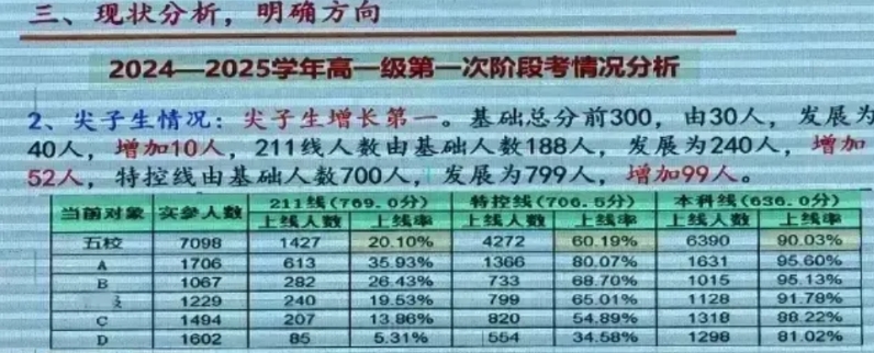 高中第一次家长会。东莞五校联考,娃的学校排名居中,位列第三! 全校1229人参加考试,平均分717.58分。 211线769分以上240人,上线率19.53%;特控线706.5分以上799人,上线率65.01%,本科线636分以上1128人,上线率91.78%。 看着这些数据,再看看娃那吊车尾的成绩,内心焦灼不已。联考成绩刚公布的时候,好几天都没睡好觉。 娃是以中考指标生的身份进的高中,分数比正取录取的同学低一点,但差别也没有那么大。暑假很多孩子都去上了初高衔接课程,我没让孩子去,想着让孩子自己找网课预习高中的课程。如今看来,孩子的预习效果差强人意,娃多半是在玩。第一次联考成绩虽然勉强过了本科线,但年级排名已经非常靠后了。接下来第二次联考能不能取得进步,完全得靠自己的努力了!