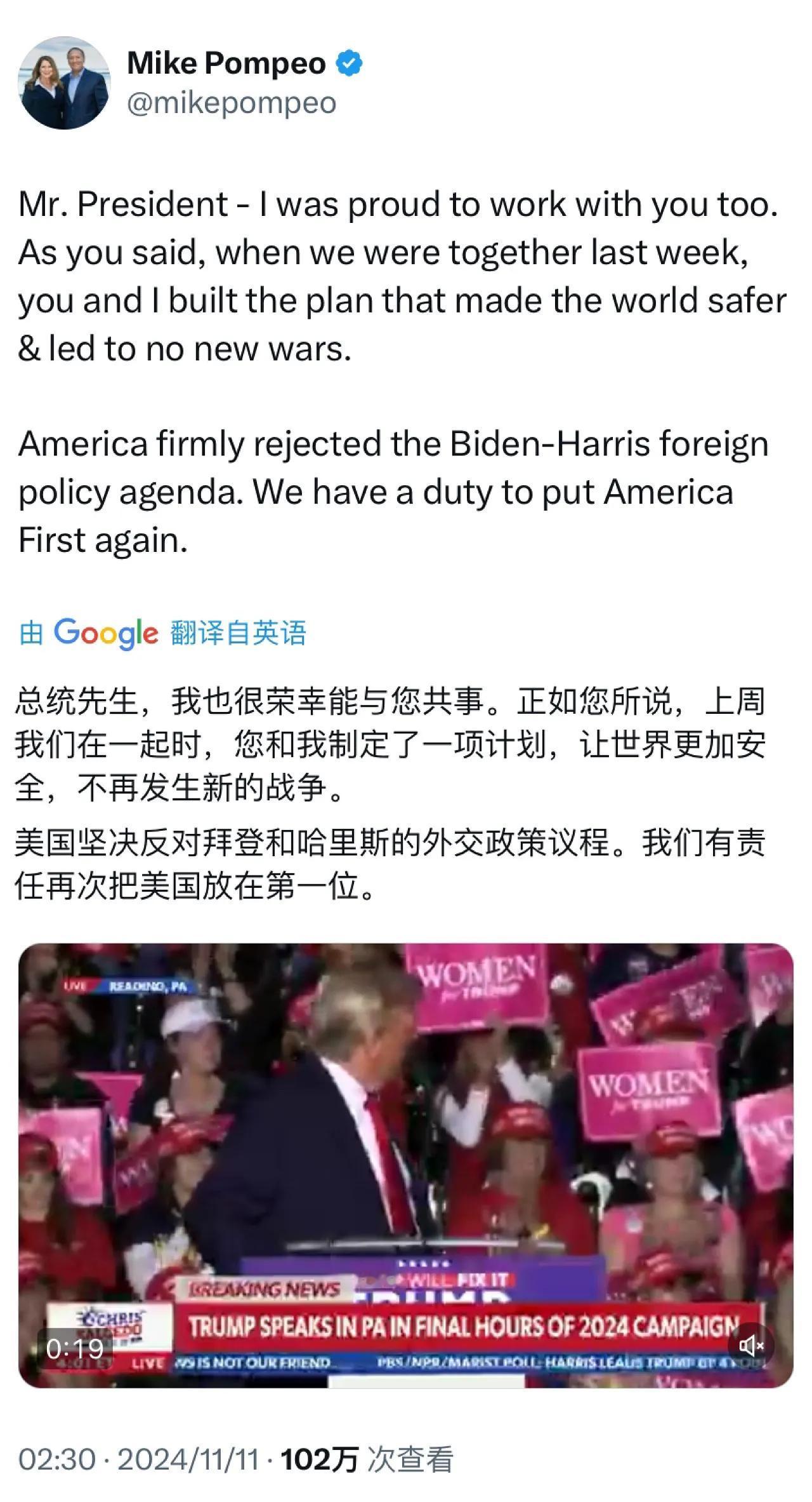 美国前国务卿蓬佩奥今天(北京时间11月11日)写道:“总统先生,我也很荣幸能与您共事。正如您所说,上周我们在一起时,您和我制定了一项计划,让世界更加安全,不再发生新的战争。美国坚决反对拜登和哈里斯的外交政策议程。我们有责任再次把美国放在第一位。” [机智]评几句:特朗普昨天发帖指出,他不会邀请黑利和蓬佩奥入阁。蓬佩奥今天发文,附上了上周特朗普在竞选集会上的一段视频。视频里特朗普指出,“他们一起制定了一些计划”,也就是蓬佩奥上文所说的“您和我制定了一项计划”。现在有两种猜测,一是蓬佩奥不甘心,还在继续贴靠特朗普。二是,尽管蓬佩奥不入阁,不会成为国务卿或防长,但是有可能成为美国总统俄乌谈判(解决俄乌冲突)特使。