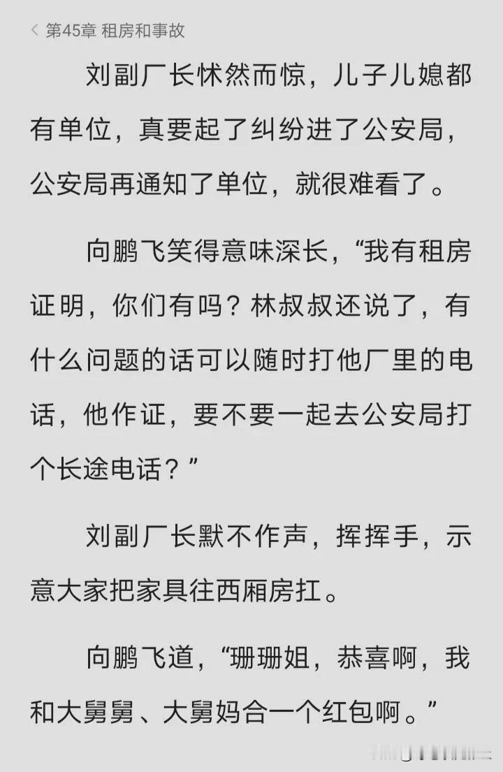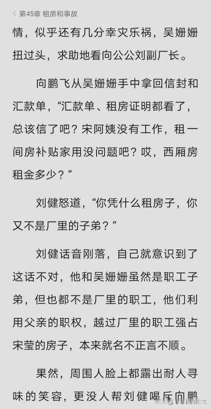 只不过剧本好像吴建国始终没有出面,只不过刘副厂长在指挥,刘健和吴珊珊打头阵,张阿妹也没出现,毕竟不是亲女儿,不会为她争房子