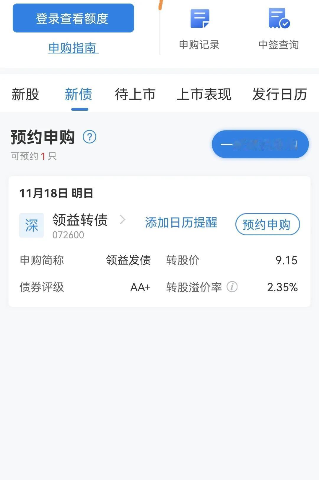 明日18号,别忘记新股申购和可转债打新。 领益转债,发行规模21亿元,最新的转股价值97.7元,转股溢价率为2.35%。发行量挺大,期待大家一起中签。 正股领益智造,主营业务:从事精密功能件,结构件等,应用于消费电子,汽车和光伏行业。 除了可转债,还有一个科创板的联芸科技,这个需要开通科创板权限。 有条件的还是很有必要去开通,看看最近的股票打新收益就知道,科创板打新绝对是大佬的盛宴。 朋友,祝你好运。