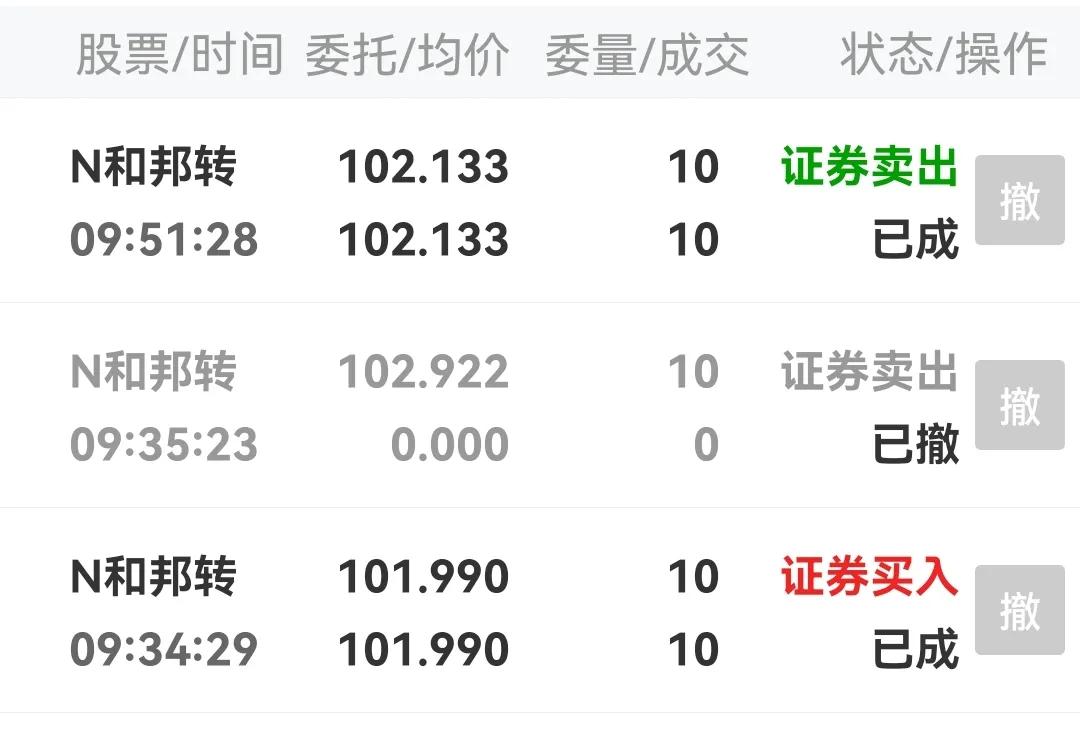低估买入 和邦生物开盘后低至101.5元,转股溢价率接近-4%。看到账户还有千把块钱,买入,然后挂单卖出,怒挣1元。 体验一把快进快出的交易快感。