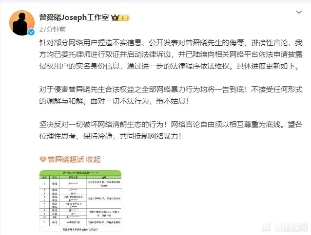曾舜晞告黑新进度 曾舜晞告黑进展 要拿起法律的武器维护自己的权利!曾舜晞工作室终于开始行动啦,针对部分网络用户捏造不实信息、公开发表的侮辱、诽谤性言论,进行取证并启动法律诉讼!支持小曾维权,让网络不是法外之地!