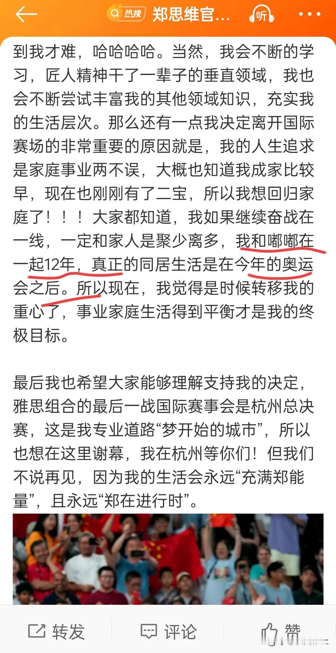 国羽郑思维官宣离开国际赛场,我却被一个细节吸引了[灵光一闪] 郑思维细数了加入国家队的种种,这些都正常,直到说到家庭,他说他今年27岁,和嘟嘟在一起12年,聚少离多,真正的同居生活在今年奥运之后[灵光一闪] 我听到了什么?27岁,在一起12年,那就是15岁就在一起了,这是早恋了吗?[捂脸] 不过他成绩已经很好了,现在二胎也生了,以后重心肯定在家庭,以他的影响力,参加活动,当个教练,完全不成问题 就像贾一凡说的,以后可以在亲子节目中看到夫妻档节目中,看到了[灵光一闪]