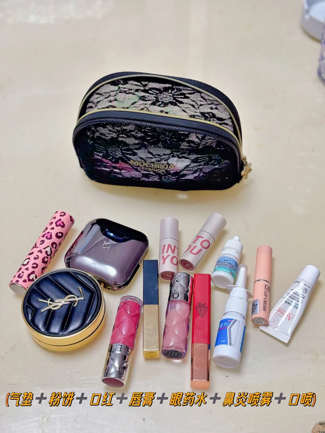 5️⃣补妆包(气垫➕定妆粉➕漱口水➕各种雾面、亮面口红)