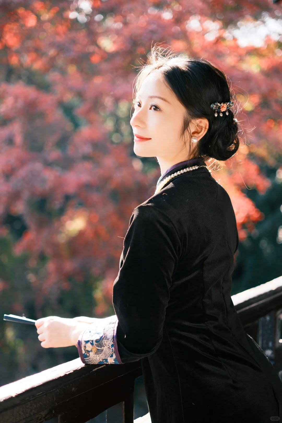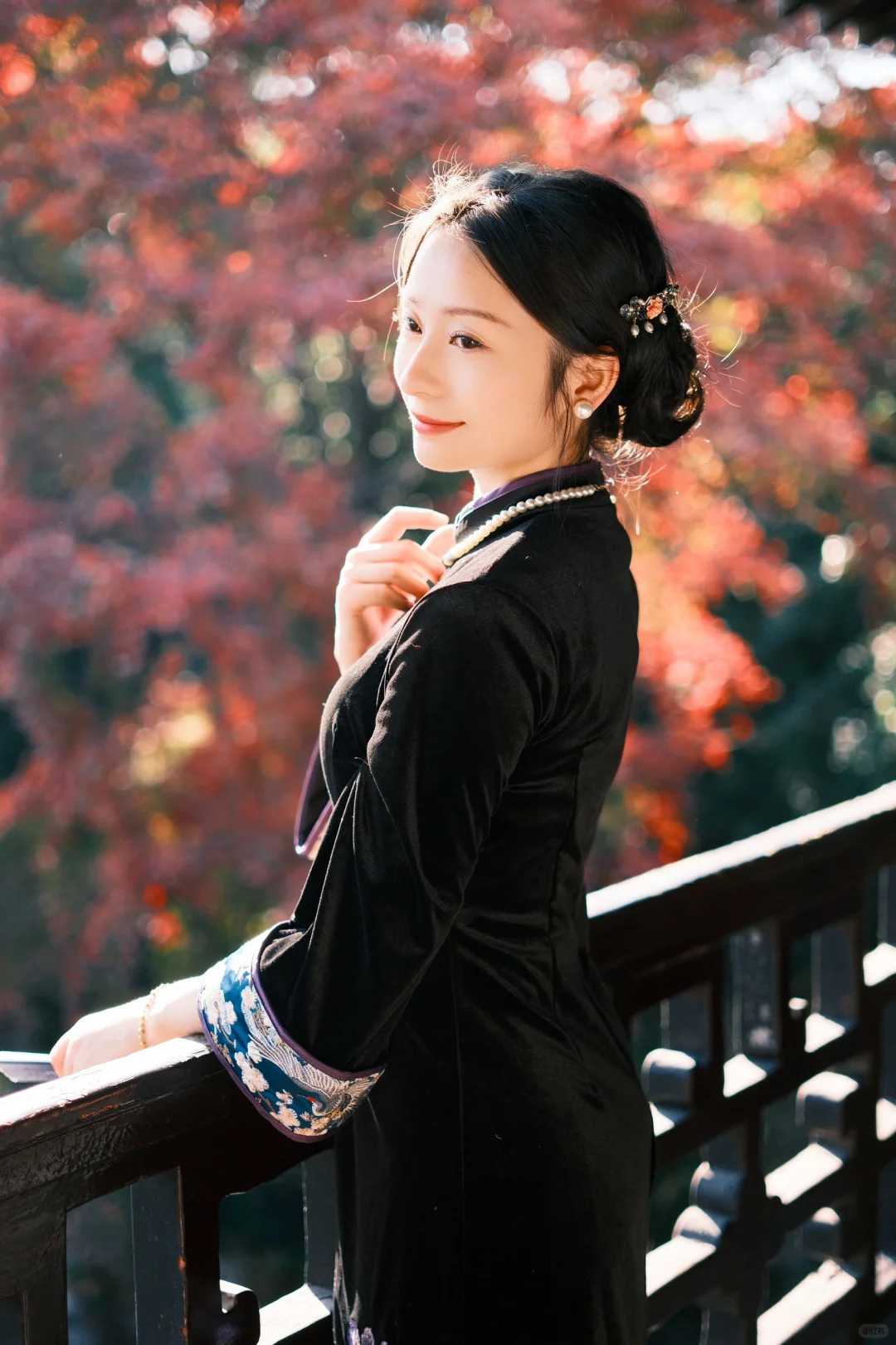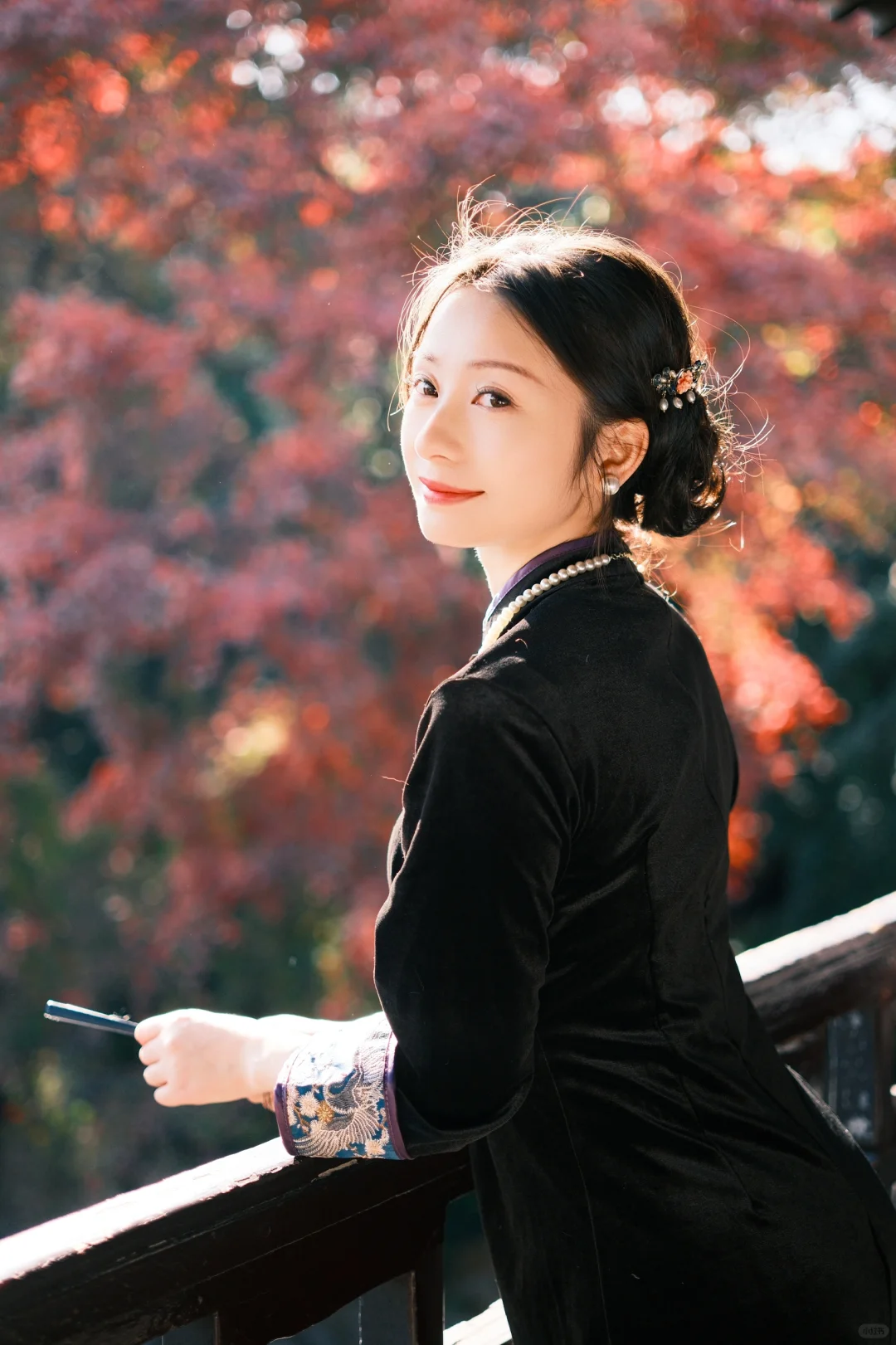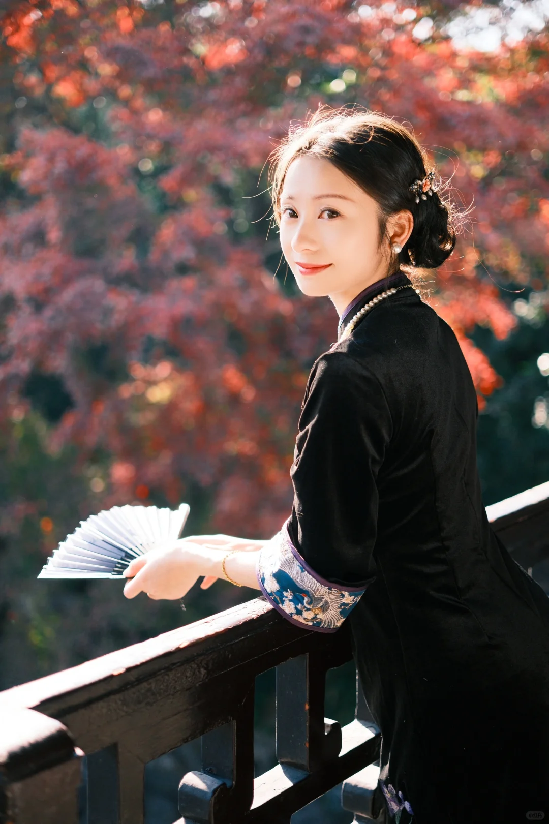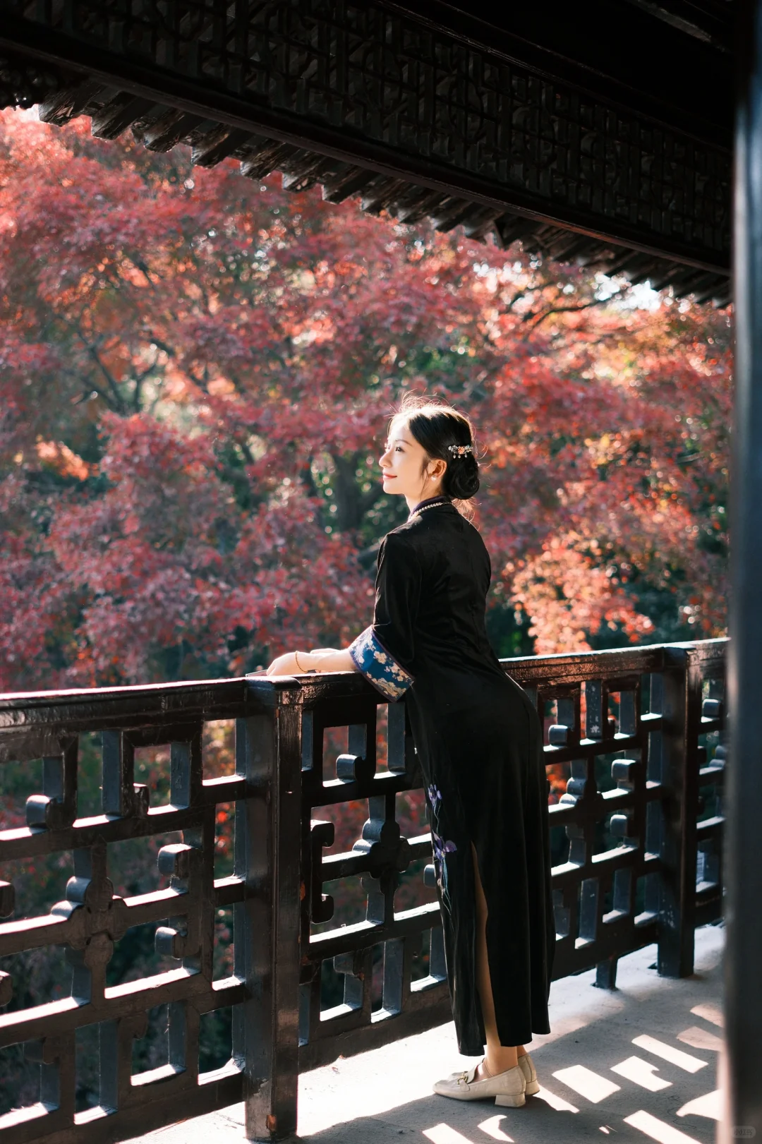 扬州何园的枫叶已经基本是红啦 正是可以拍照的好时候 旗袍真的是太温柔啦 附富士参数 滤镜:nc 白平衡白色优先 动态范围自动 d范围优先级 关 色调曲线H-1.5 S-1.5 色彩强 彩色fx蓝:强 色彩:+1 锐度:0 高iso降噪:-2