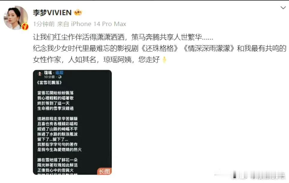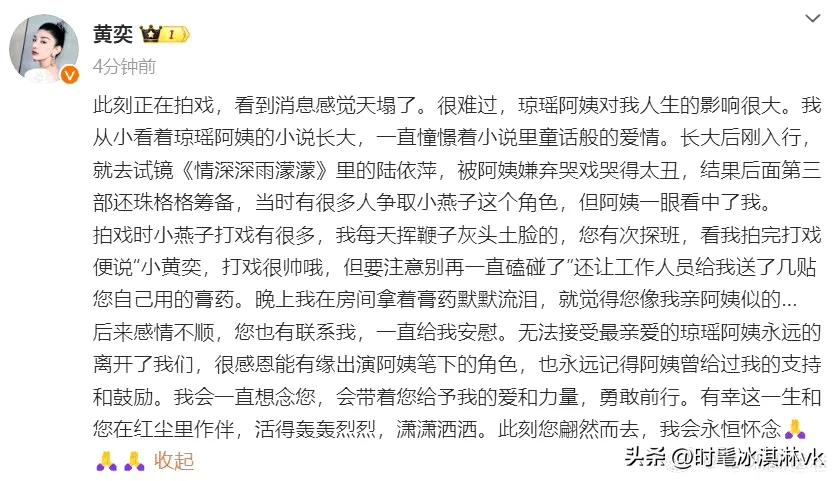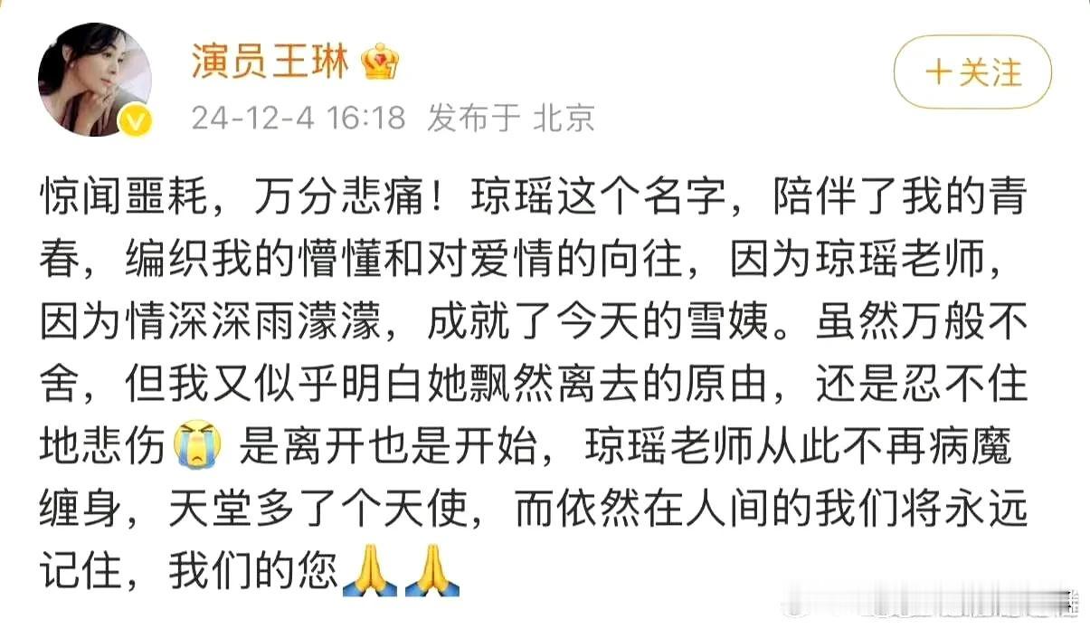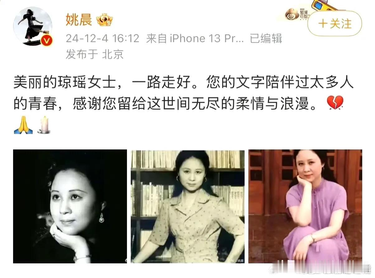 赵薇,苏有朋,林心如~纷纷发文悼念琼瑶 可以说娱乐圈半边天都是演琼瑶剧起来的,琼女郎都有好多代,刘雪华,陈德容,赵薇,林心如,范冰冰…… 所以琼瑶的离世,震动了半个娱乐圈,大家或多或少都是她提拔起来的,她的眼光真的好,演过琼瑶剧的女主角,基本后来都火了 连好久不出来的赵薇都发文悼念琼瑶阿姨了,言情时代算是结束了