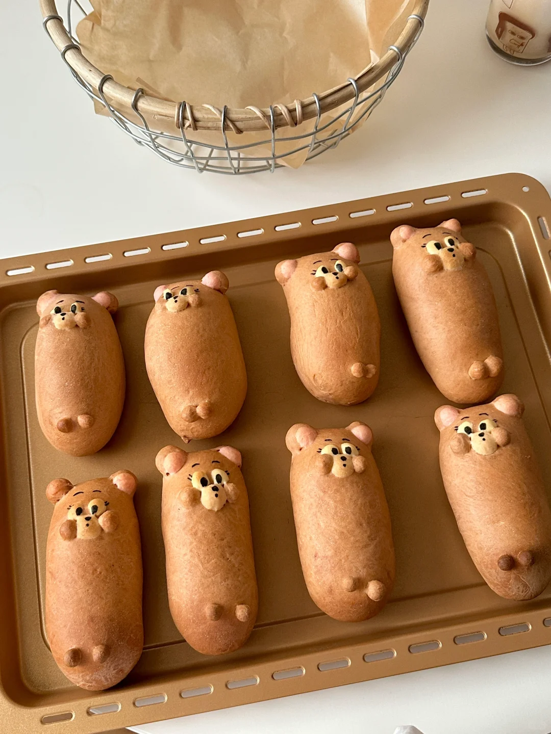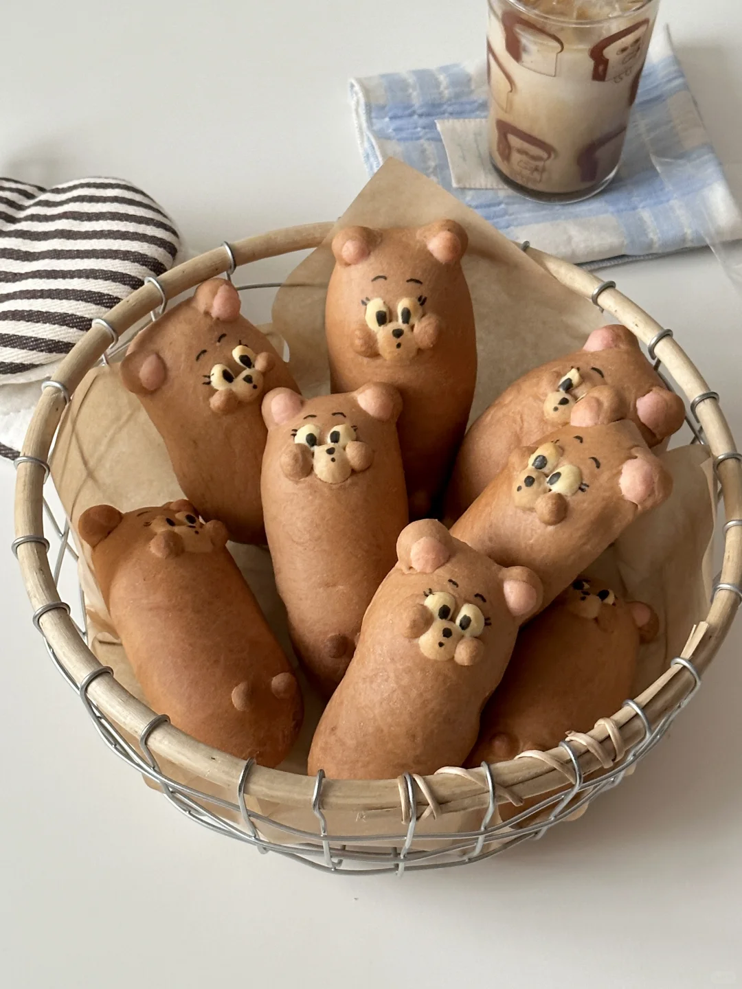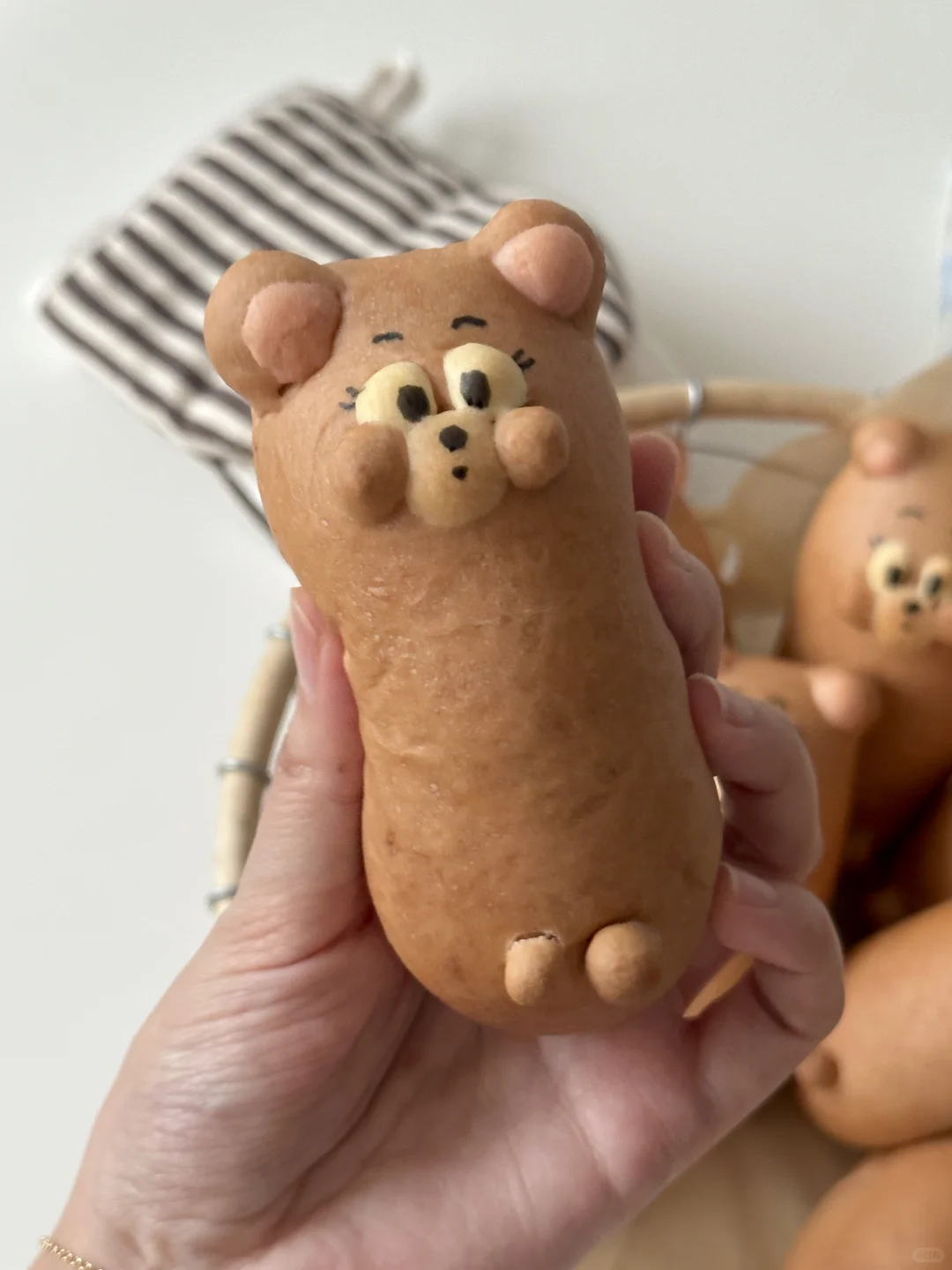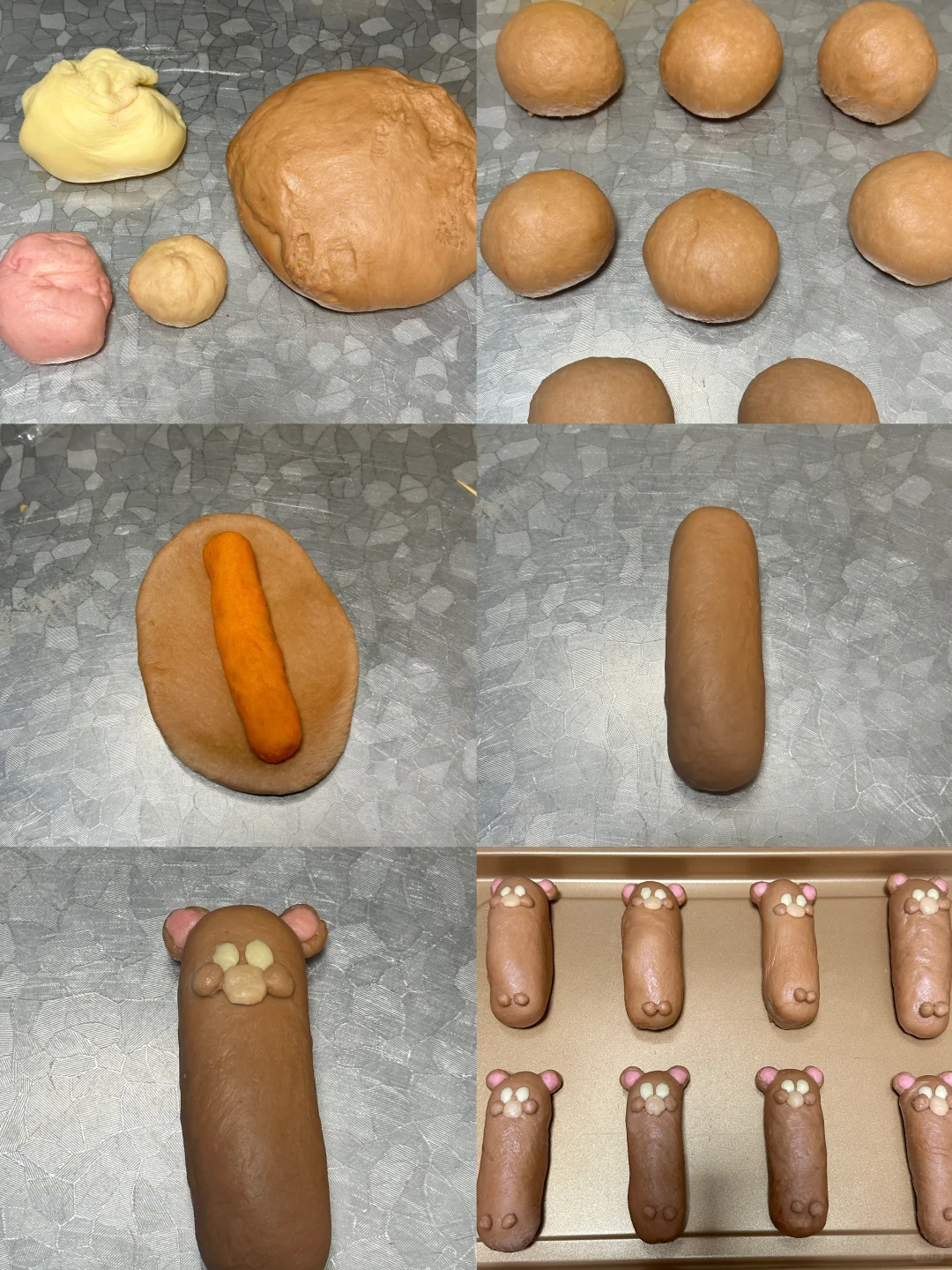6️⃣取每个面团45g,包入搓成圆柱形的蜜薯泥,涂些水装饰自己,这样粘合更牢固~如图十一所示制作Jerry面包