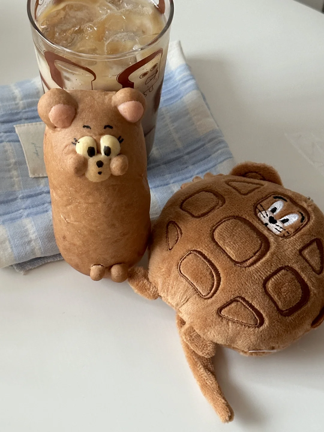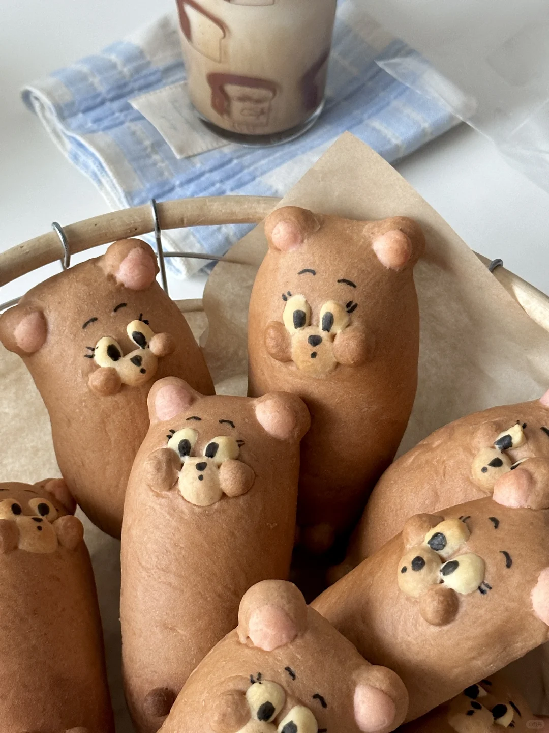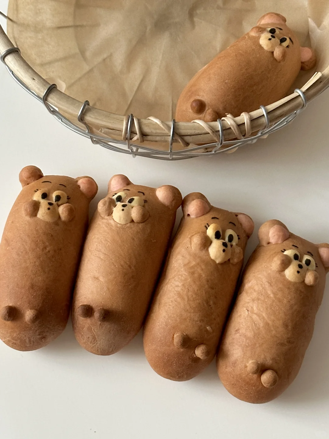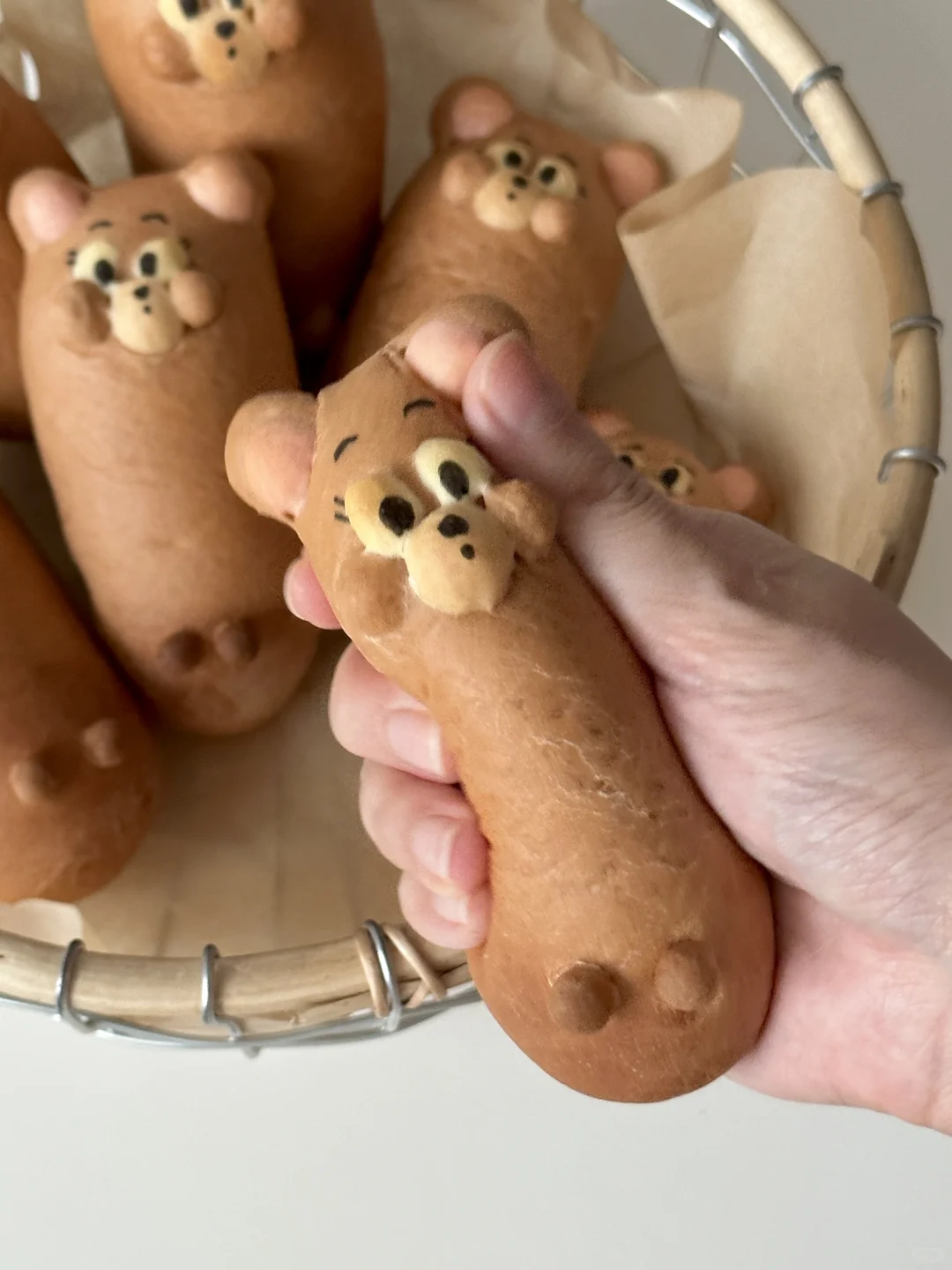 6️⃣取每个面团45g,包入搓成圆柱形的蜜薯泥,涂些水装饰自己,这样粘合更牢固~如图十一所示制作Jerry面包