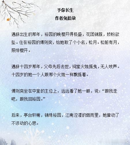 推文 予你长生作者兔拾柒遇辞出生的那年,裕园的晚樱开得极盛,花团锦簇,娇粉欲坠。住在裕园的傅则奕,给她取了个小名,松月。松前有月,照绯樱开。遇辞十四岁那年,父母先后去世,祠堂火烛摇曳,无人吱声。十四岁的她一个人跟那个火烛一样飘摇着。傅则奕坐在中堂的主位上,远远看了她一眼,说:“跟我走吧,跟我回裕园。”后来,亭台轩榭,锦绣裕园,江南涳濛的烟雨里,她曾动了不该动的心思。