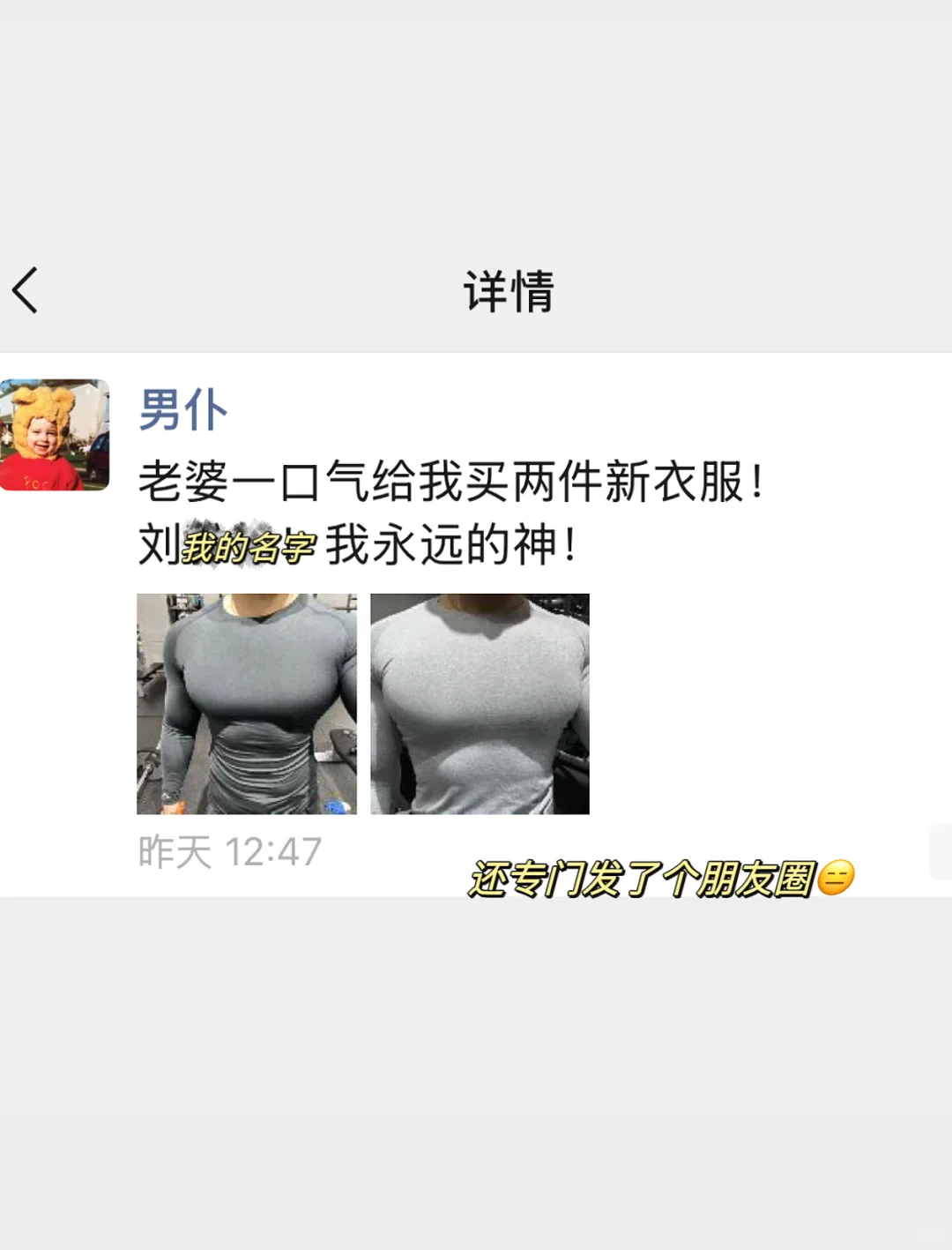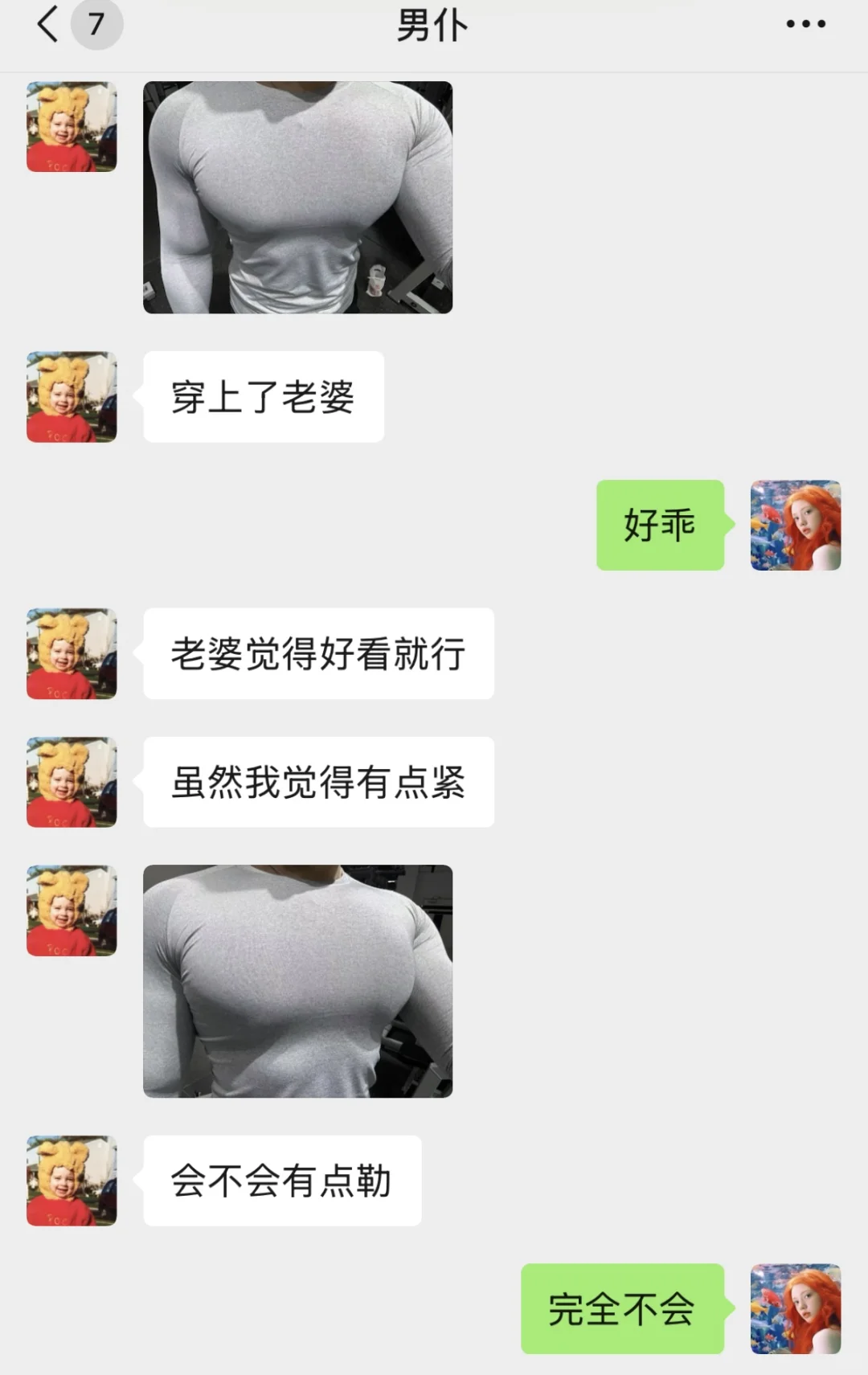黑色小紧身衣把肌肉轮廓显现得一览无余,如果灯光再暗些,有点说不出的秀色可餐,于是索性,我又给他买了件灰色的。