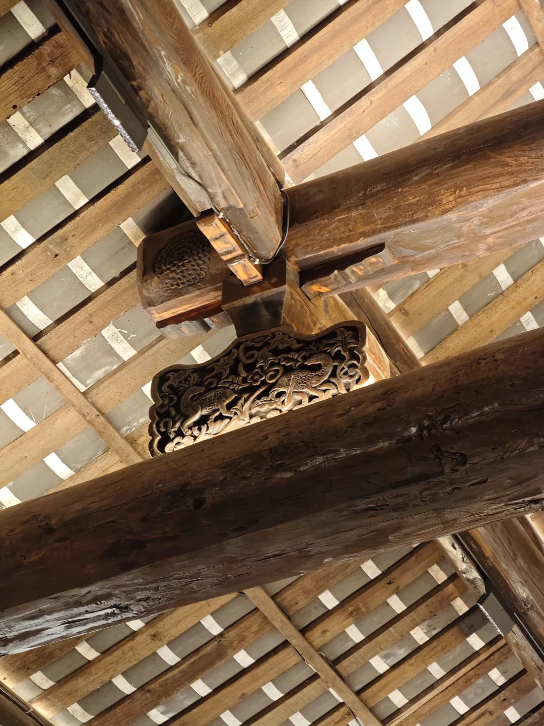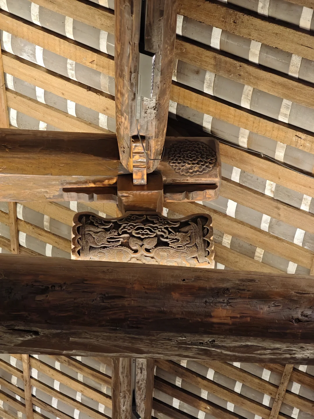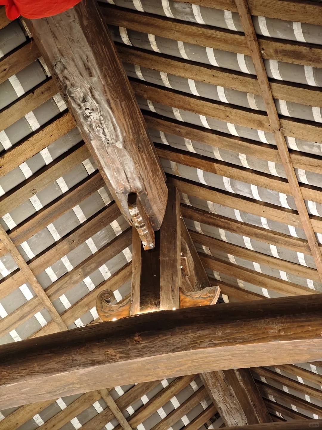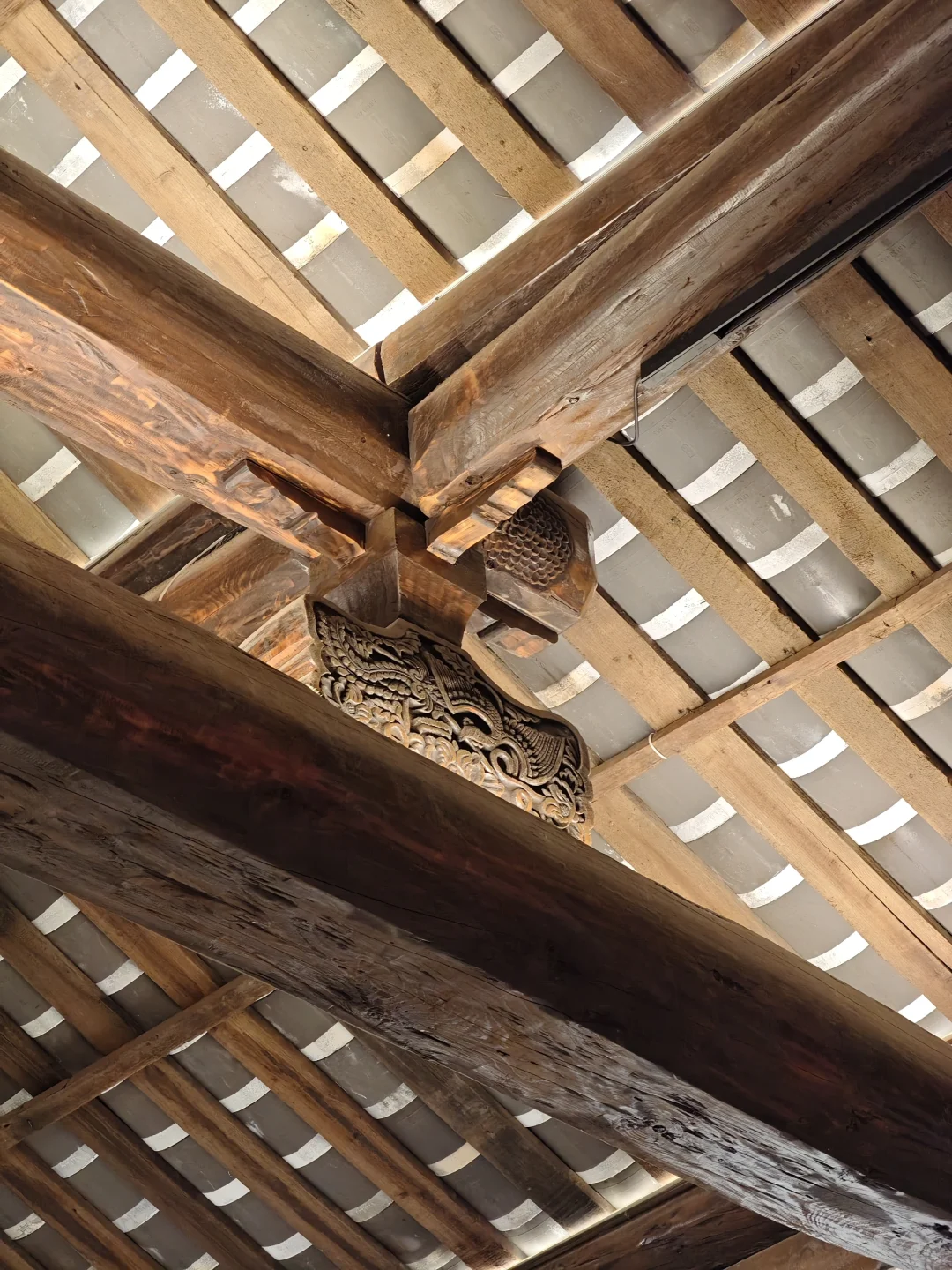 betterme 1 2024-12-11 22:29 四椽栿和平梁用材略微弯曲看着就老。瓜柱小别致上施卢斗和替木,我见识少没见过。好像还有捧节令拱。当心用抬担似乎减了一柱,其余都是明显的穿斗。这做法确实讲究了。