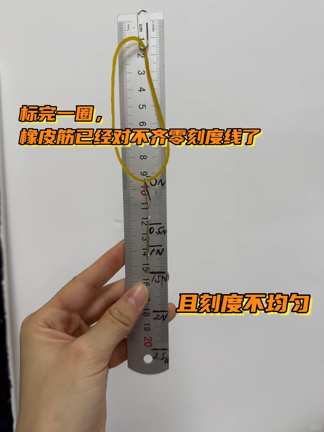 2️⃣标完回到“起点”,已经对不齐零刻度线了(说明橡皮筋太容易变松了,比弹簧更容易)