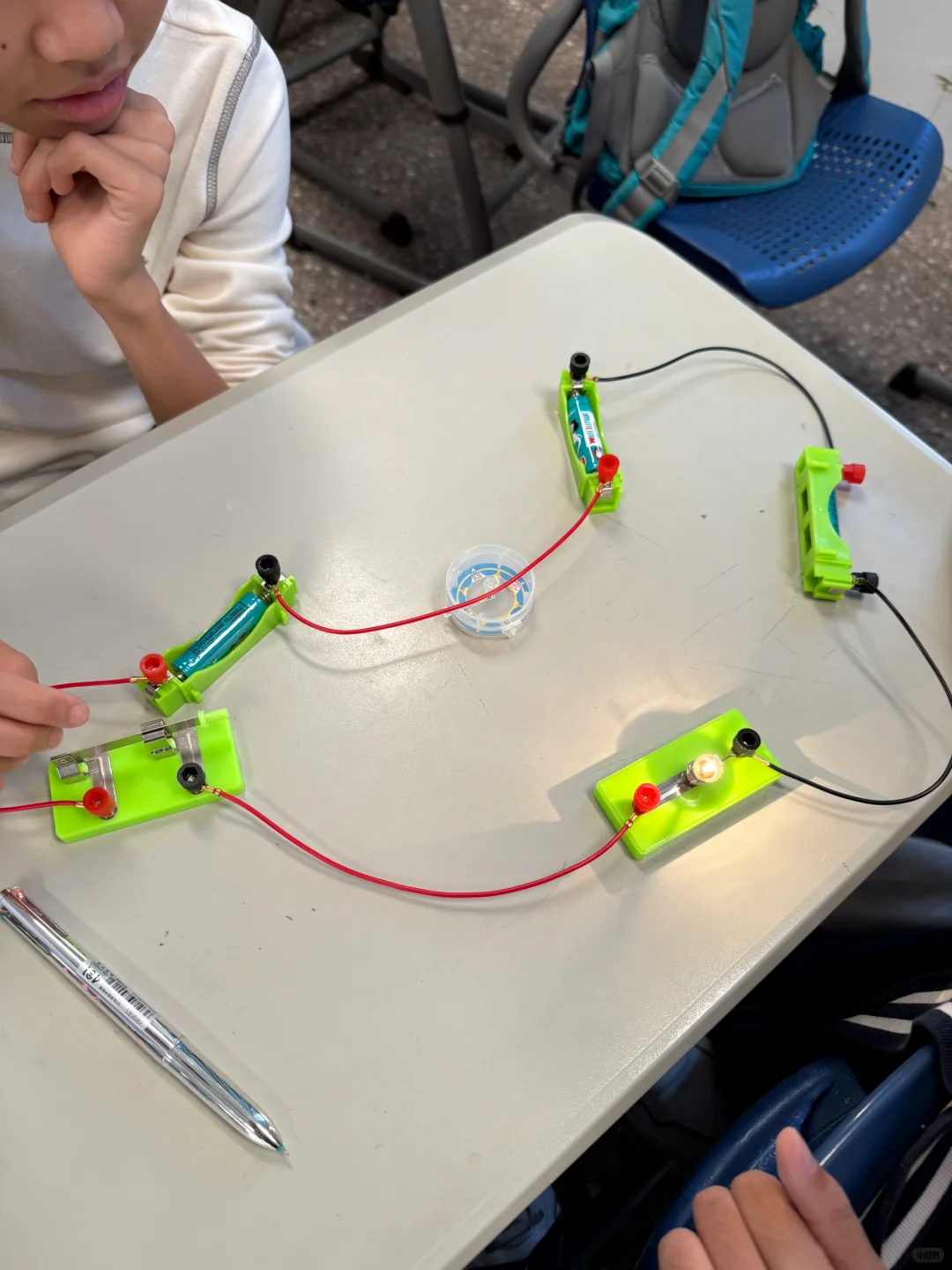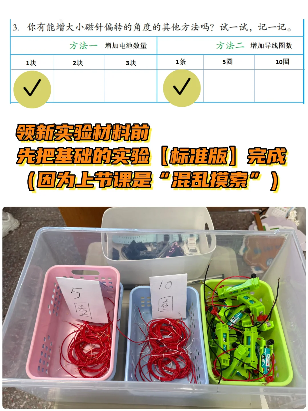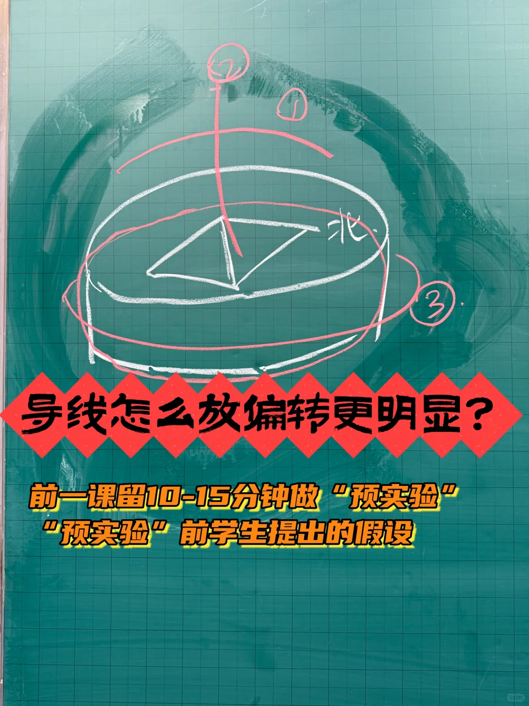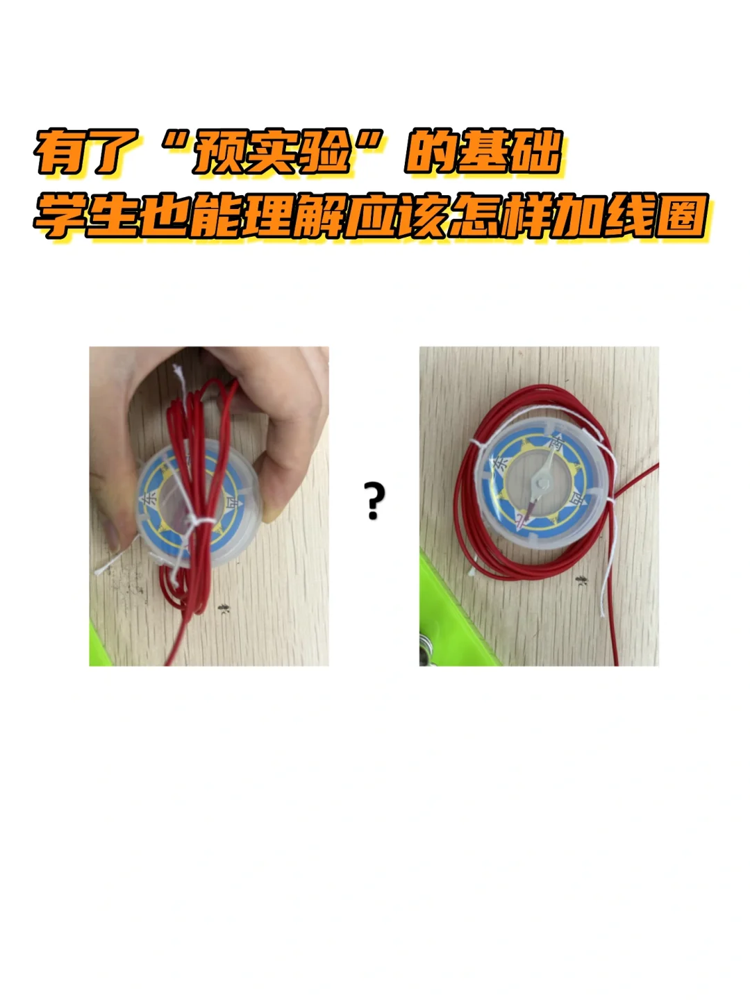 [爆炸R]刚好前一课不需要用完一节课的时间,所以我用多出来的时间做了个【预实验】,实验目的是初步探究【导线怎么放】指南针偏转更大。事实证明“预实验”很有用[赞R]