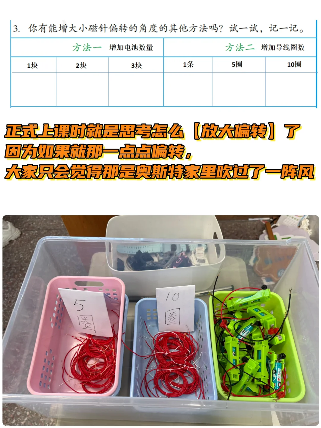 [爆炸R]这节课问“怎么进一步放大偏转角度”时,本来鸦雀无声,但当有一个学生提到可以【增大电流】时,班上举手的孩子就多了