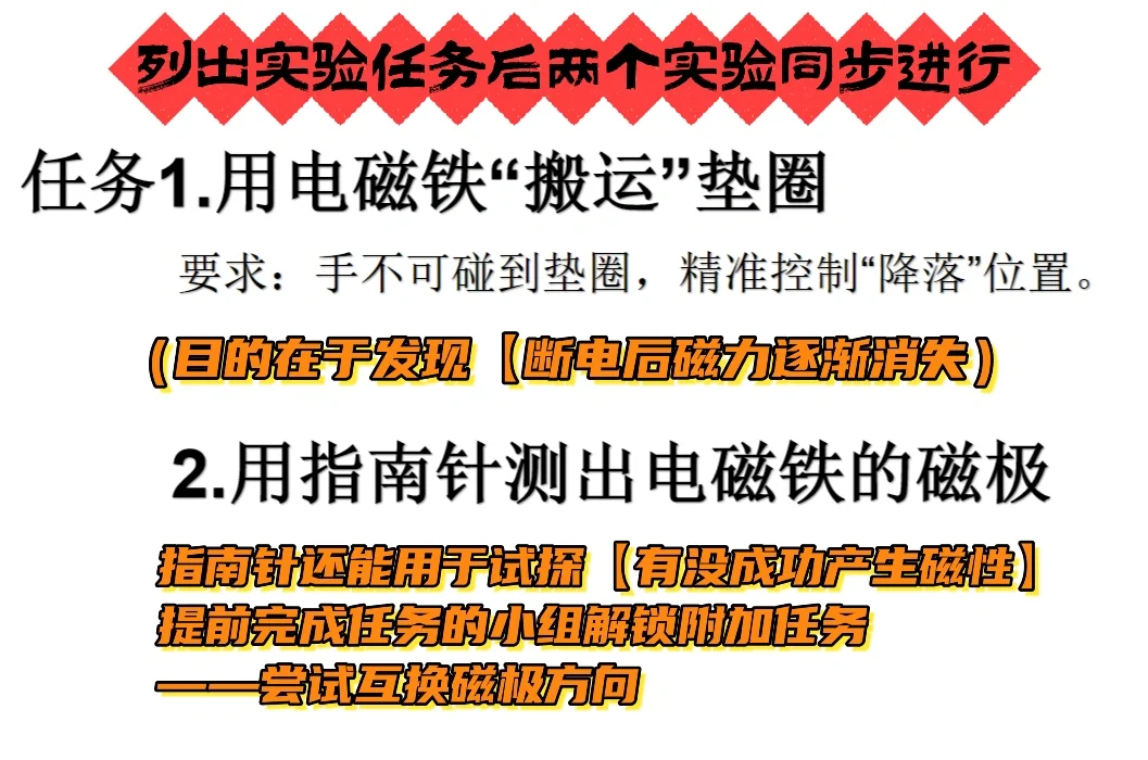 [星R]两个任务一起做是因为我认为这两个任务是相辅相成的。当学生怀疑自己的电磁铁吸不起铁圈是不是做失败了的时候,指南针可以告诉他们——有磁性!只是还不够!