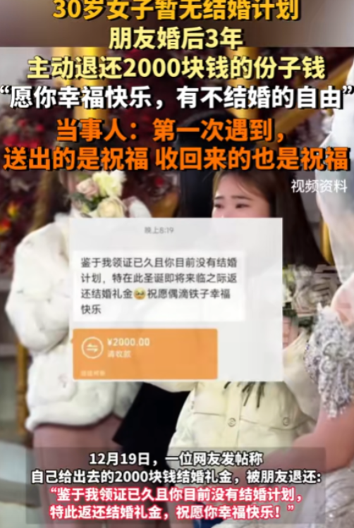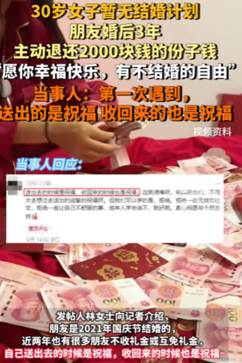 30岁女子暂无结婚计划,朋友婚后三年,主动退还2000块钱的份子钱,并祝福她:“愿你幸福快乐,有不结婚的自由!”第一次遇到这种送出的是祝福,收回来的也是祝福,网友:“这样的朋友给我来一打!”