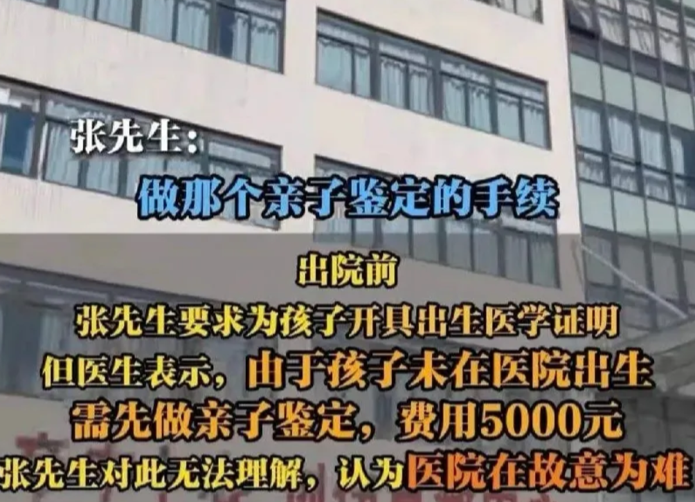 深圳,一产妇在突然在家临产,脐带不慎断开,事后丈夫去医院给刚出生的婴儿办理“出生医学证明”,却被告知婴儿并非在本院所生,需要花5000元做亲子鉴定,证明婴儿与男子及妻子的血缘关系,才可以办理“出生医学证明”,这让产妇的丈夫对此无法理解,认为医院在故意为难患者。医院:符合规定!