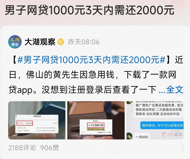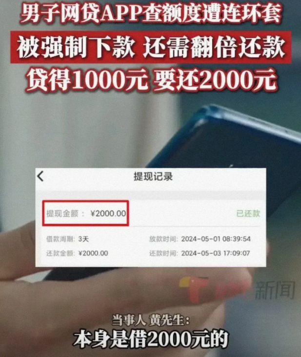 广东佛山,一男子因急用钱,下载了一款网贷app,他本想借2000元,但该app只能贷1000元,且需在3天内还2000元。若不按时还款,1天要收600元利息,万万没想到的是,他注册登录后查看了一下贷款额度,就被强制下款!男子直接懵了! (来源:环球网) 再一次遭到公司拒绝后,黄先生很沮丧,他一直努力地在佛山这座繁华的城市,找寻属于自己的立足之地。 但不知道是命运弄人,还是其他原因,现在窘迫得连吃饭都成了问题,投递了无数简历,参加了无数次面试,都始终未能如愿。 因为生活费的问题,黄先生想要找平台或公司借两千块钱,先过渡一下,等到后面拿到钱,马上把这两千块钱还了。 就这样,黄先生下载了一款网贷app。