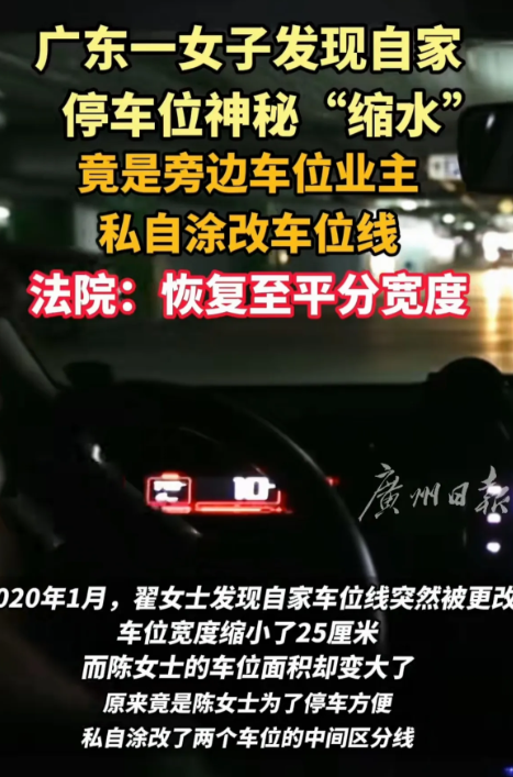 广东,一女子发现,自家车位突然神秘缩水,宽度缩小25厘米,自己停车特别费劲,而相