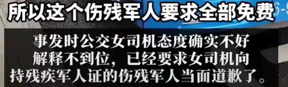 广西巴马县,一名残疾军人在搭乘公交车时,展示了他的残疾军人证,希望能够依据规定免费乘车。然而,他遭遇了女司机的粗暴对待,她不仅大声斥责,还表现出不耐烦的态度,明确表示该证件在当地不适用。面对这种不公正的对待,军人感到非常愤怒,但为了避免与司机进一步争执,他选择了不与对方理论,默默地离开了公交车。   在那个寒冷的冬日,一位残疾军人在广西巴马县的街头等待着公交车,他的手中紧握着那本代表着他为国家付出过牺牲的残疾军人证。   当公交车缓缓驶入站台,他随着人流登上了车,心中带着一丝期待,因为他知道,根据国家的规定,他有权免费乘坐公共交通工具。   当他向女司机展示自己的残疾军人证时,事情并没有按照他预期的那样发展。   女司机的态度出乎他的意料,她没有展现出应有的尊重和理解,反而用一种不耐烦的语气大声告诉他,这个证件在她的车上并不能让他免费乘车。   她的声音在车厢内回荡,让周围的乘客都投来了关注的目光。   他本想继续与司机理论,维护自己的权益,但当他转头看到车后还有许多焦急等待的乘客,他们的眼神中充满了期待,他意识到自己的坚持可能会耽误大家的时间。   于是,他选择了沉默,并下车。   这件事迅速发酵起来,人们纷纷指责这名不尊重军人,非常无理的女司机,而女司机所在的公车公司也因为了网友们的热议,处于舆论的风口浪尖。   而公交车公司在事情发生后不久也在网上作出回应,称当时女司机的态度确实有问题,已对她进行过严厉地批评,并让这位司机向当时乘车的军人进行道歉。   时候有媒体联系到了广西巴马县的相关工作人员,主要是核实一下女司机的话是否熟悉,在巴马县残疾军人证就是无效的吗?   工作人员告诉记者,因为这款车不属于一般的公交,它是往返于城镇间的,因此都是按照距离收费,持有残疾军人证可以免除一半的票价。   按照当地的政策规定,对这个残疾军人能否全免要看具体的政策内容,但是一般情况下,持有爱心卡是可以免费乘车的。   该军人仅向女司机展示了他的残疾军人证,并未提供爱心卡,因此女司机认为他不符合免费乘车的条件。   然而,女司机在处理这一情况时表现出的态度不当,并且她对相关政策的理解似乎也不够透彻,未能及时向军人提供恰当的解释,这无疑是她工作中的疏忽。   但有的网友对女司机的处理措施表示不满,认为女司机的行为是对军人的极不尊重,应该给予更严厉的处罚。   但这件事也不全是女司机的错,主要还是公交公司没有对持有证件的特殊情况乘车时享有的优惠告知清楚,女司机也只是按照规章办事。   对于残疾军人等特殊群体的优惠政策,政府和相关部门应该加大宣传力度,确保政策的普及和知晓度。   这样,不仅可以减少类似事件的发生,也可以让特殊群体感受到社会的尊重和关怀。   在遇到类似情况时,公众应该保持理性和同情心,给予军人应有的尊重和支持。   公交公司也需要加强对员工的培训,确保他们能够准确理解和执行相关政策,同时也要提高他们的服务意识和态度。   对此,你怎么看呢?
