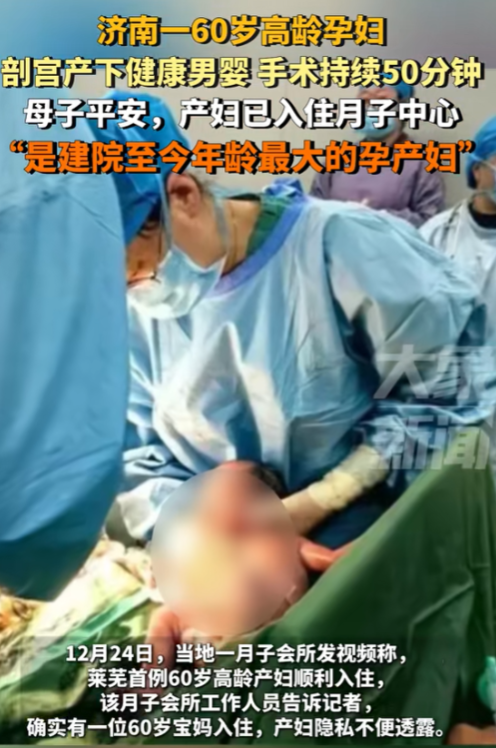 (来源:海报新闻2024年12月25日关于《月子会所回应60岁孕妇产下男婴,母子平安产妇已顺利入住》的报道)