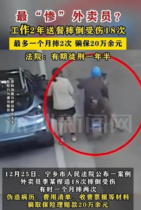 经过法院审理查明,马长平在2022年7月至2024年1月送外卖期间,18次编造自己在工作期间,送餐时摔伤的假象,谋取保险赔偿。