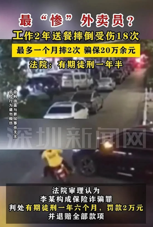 他一共干外卖两年,总共摔了18次,保险公司觉得这有点不太可能,肯定里面有什么不可告人的秘密。