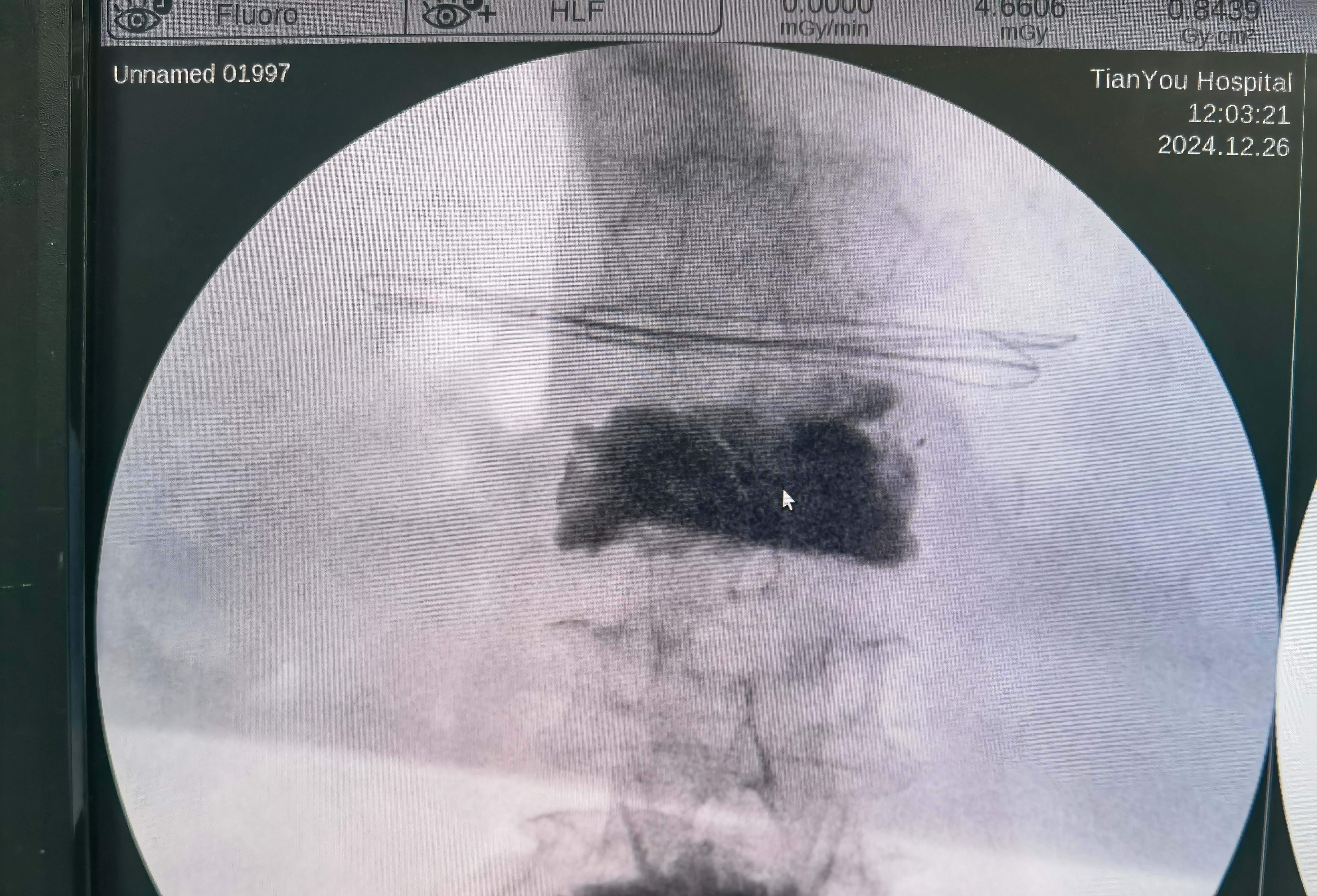 老人家的脊柱骨折首选微创手术,不建议保守治疗。看这个老太太,躺着做CT显示胸12椎体高度可,但是骨头里面有一个很大的空洞。站着拍片子这个椎体明显变矮了。这就是很恐怖的一种不稳定脊柱骨折。我们局麻注射骨水泥,注射了将近20毫升,这是极限操作,目的是把大空洞完全填满,把骨头撑起来,消灭不稳定。如果稍微少填一点,可能手术后还是不稳定,就会再骨折。这种极限操作的风险是很高的,水泥有可能漏到神经周围,导致病人瘫痪。所以大部分医生会选择做大手术,钉棒固定。
