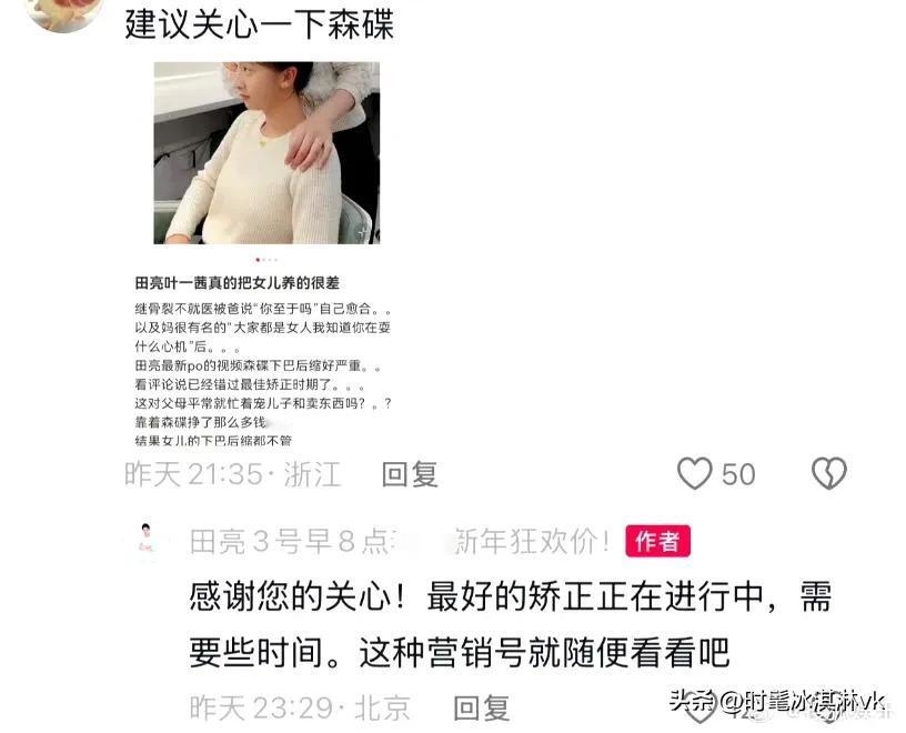 田亮回复了网友的提问,说有帮森蝶做矫正的[机智] 有网友在底下评论,说关心关心森蝶吧!小时候多可爱的女孩子,现在怎么被田亮夫妻俩养得这么差,下巴后缩很严重 然后田亮本人火速回复,给森蝶进行了最好的矫正,只不过需要时间,还让网友不要信营销号的话 今天田亮还晒一家四口的照片,说女儿会越来越漂亮,照片里面森蝶笑的好开心