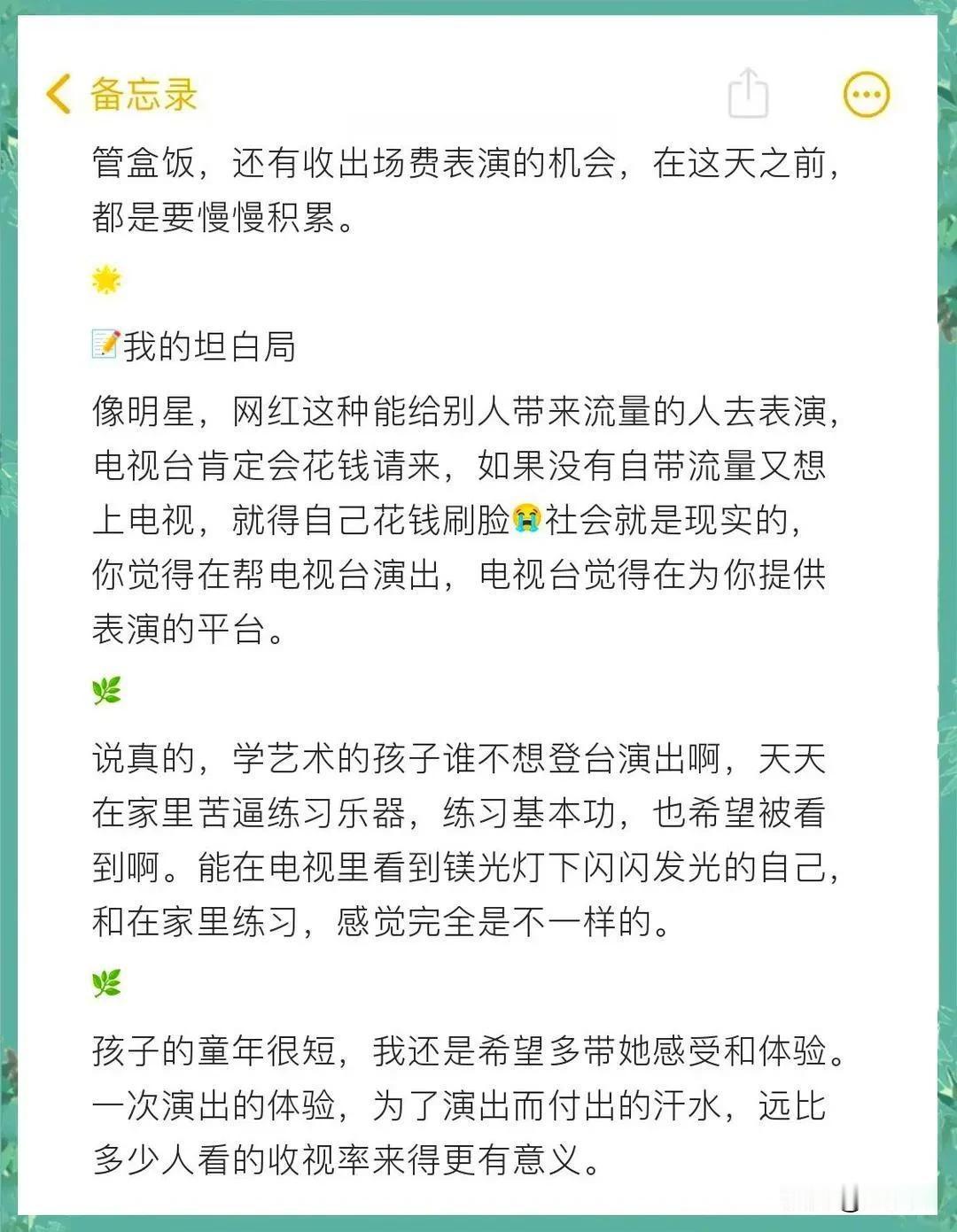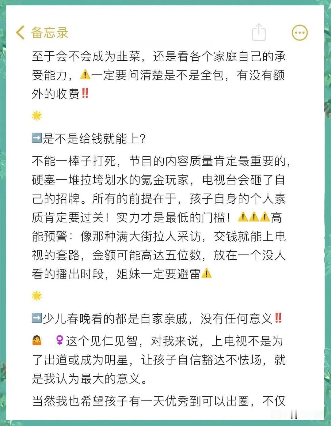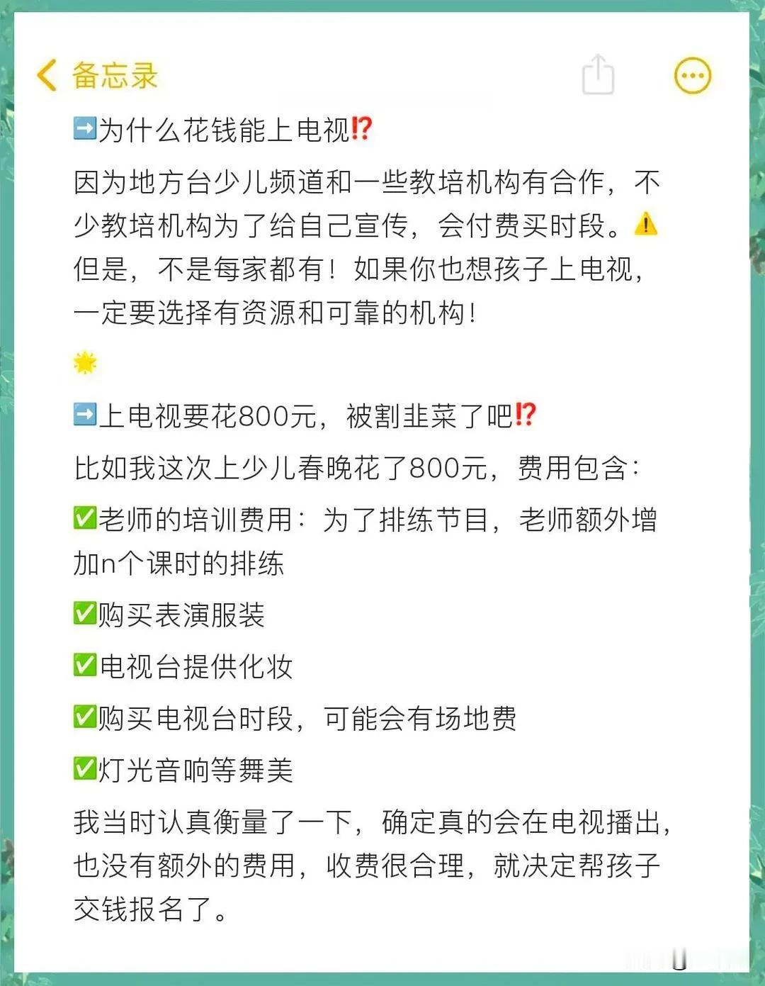 被割韭菜了?参加济南电视台少儿春晚录制,原来大部分节目是花钱的啊,是不是都这样! 给孩子平时报了舞蹈课,不是为了走这条路就是让孩子有个爱好,培养下仪态,大部分家长应该都这样。从11月舞蹈课教育机构老师说,报名参加上济南市电视台的表演节目,是少儿春晚的,一人300元,衣服、鞋、车行都是自己解决。 一直以为上春晚,电视台是给钱的,原来是给他们钱,怪不得很多老师说自己组织电视台春晚节目,似乎也没那么难。不过从网上查了下,也不是随便能去的,教培机构要有这个实力! 不过300还是可以接受的。毕竟给孩子一个上舞台的机会和历练!