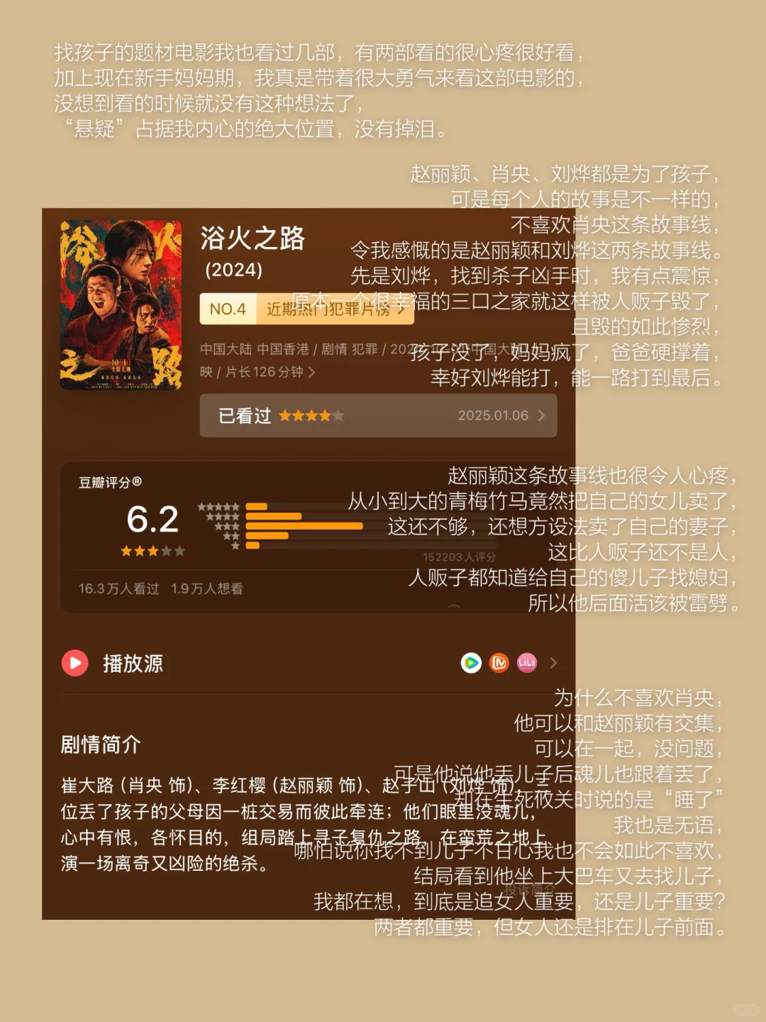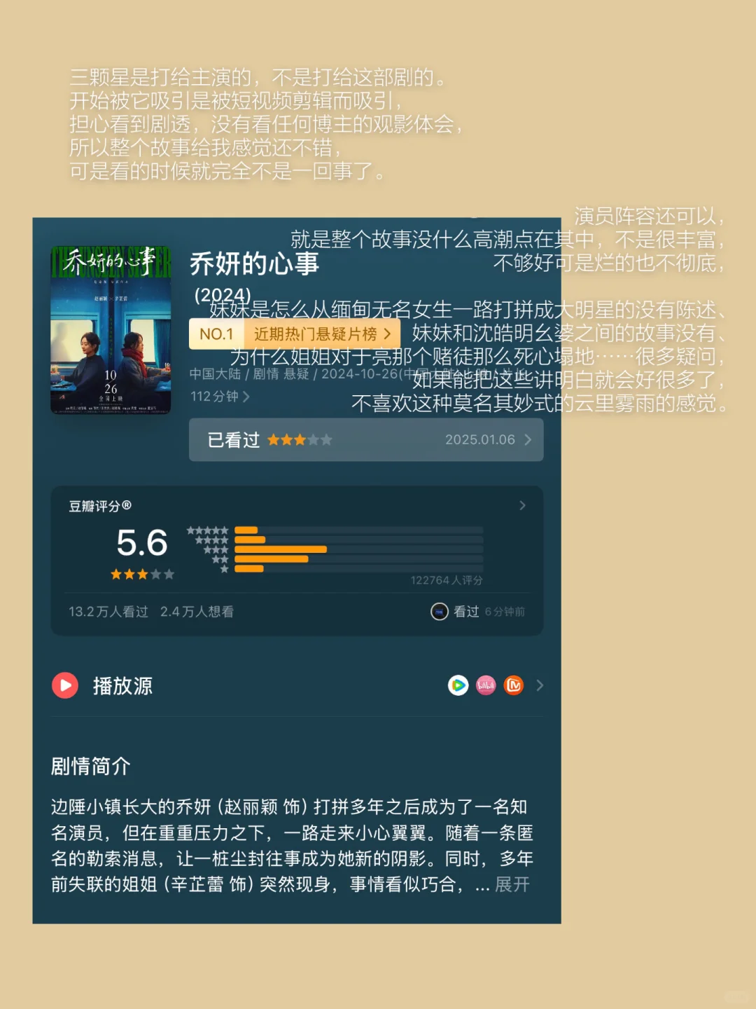 三颗星是打给主演的,不是打给这部剧的。开始被它吸引是被短视频剪辑而吸引,担心看到剧透,没有看任何博主的观影体会,所以整个故事给我感觉还不错,可是看的时候就完全不是一回事了。