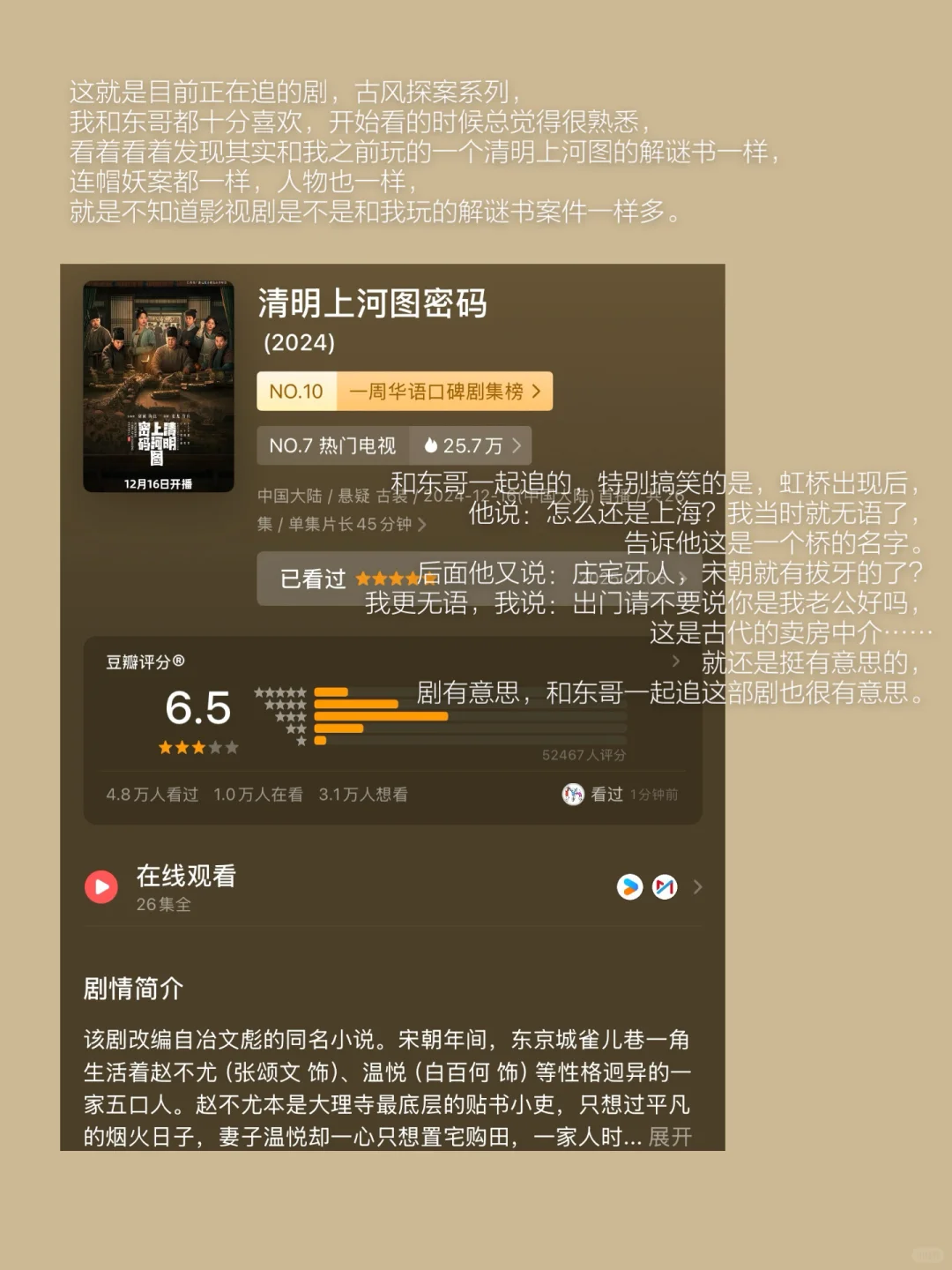 这就是目前正在追的剧,古风探案系列,我和东哥都十分喜欢,开始看的时候总觉得很熟悉,看着看着发现其实和我之前玩的一个清明上河图的解谜书一样,连帽妖案都一样,人物也一样,就是不知道影视剧是不是和我玩的解谜书案件一样多。