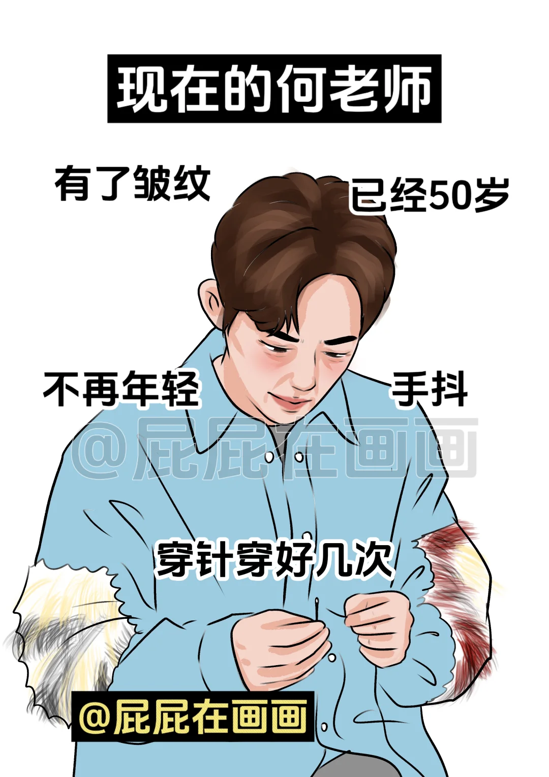 现在的何老师:穿针手抖,得戴老花镜了,有了皱纹,已经50岁了