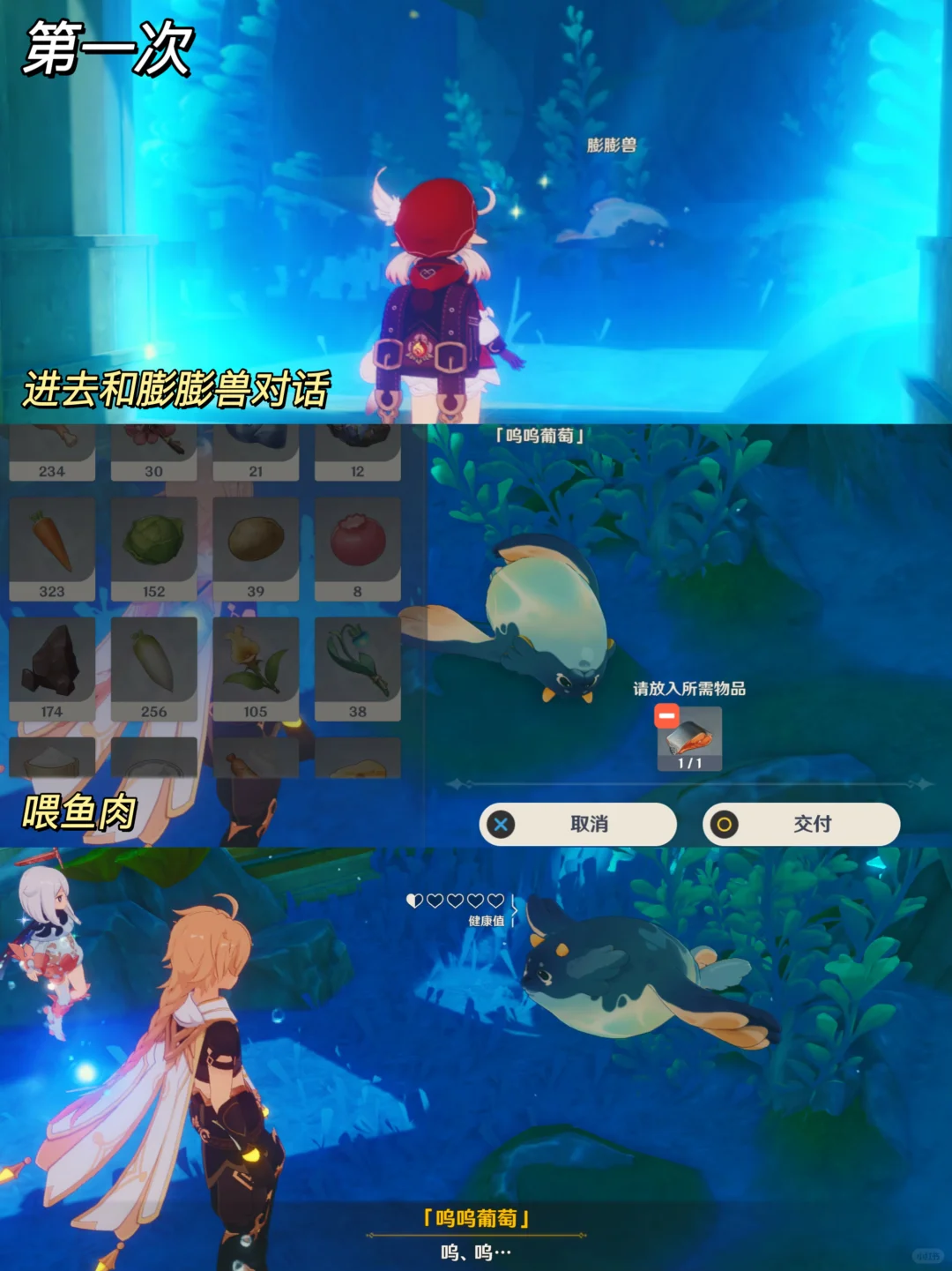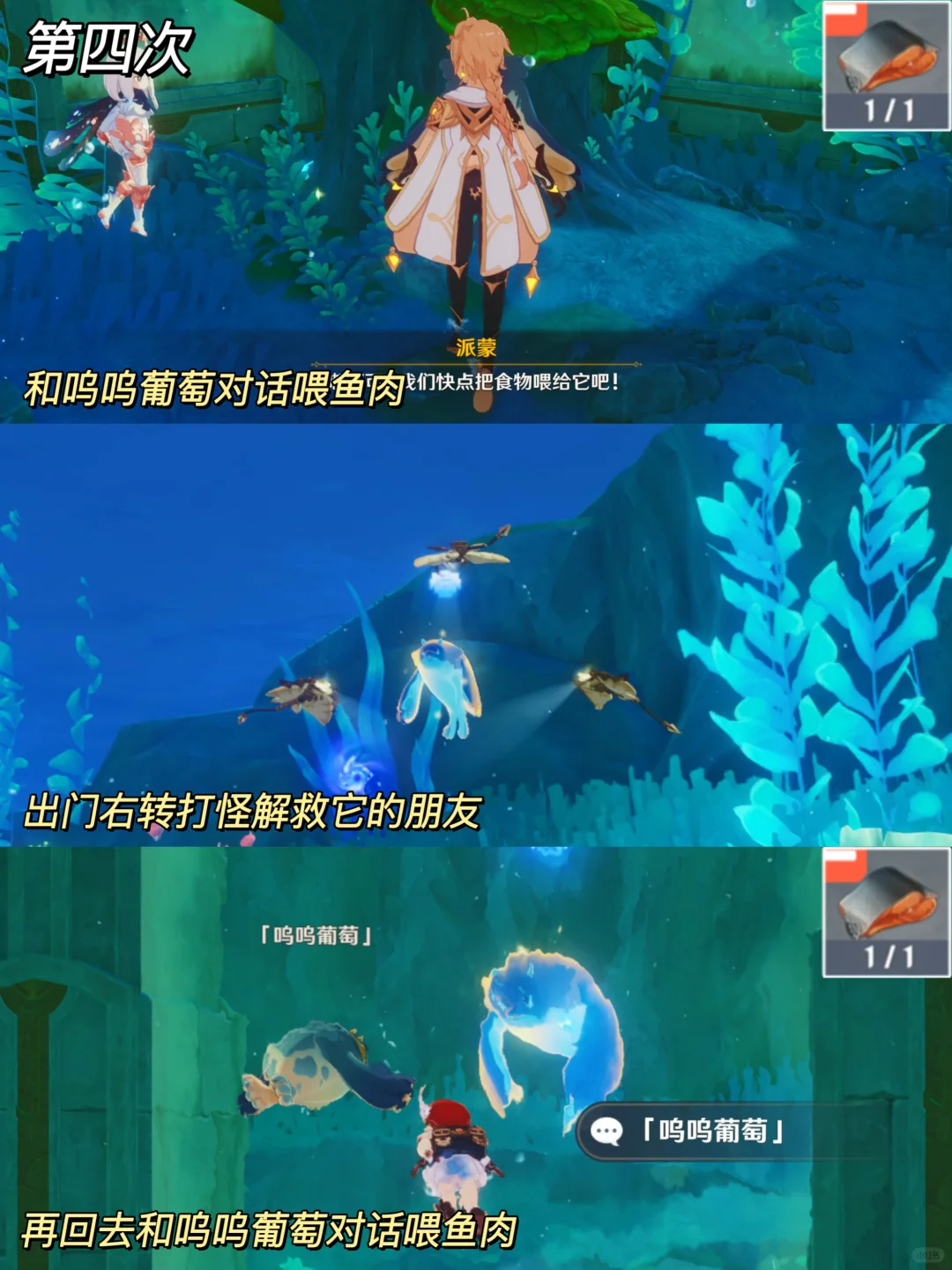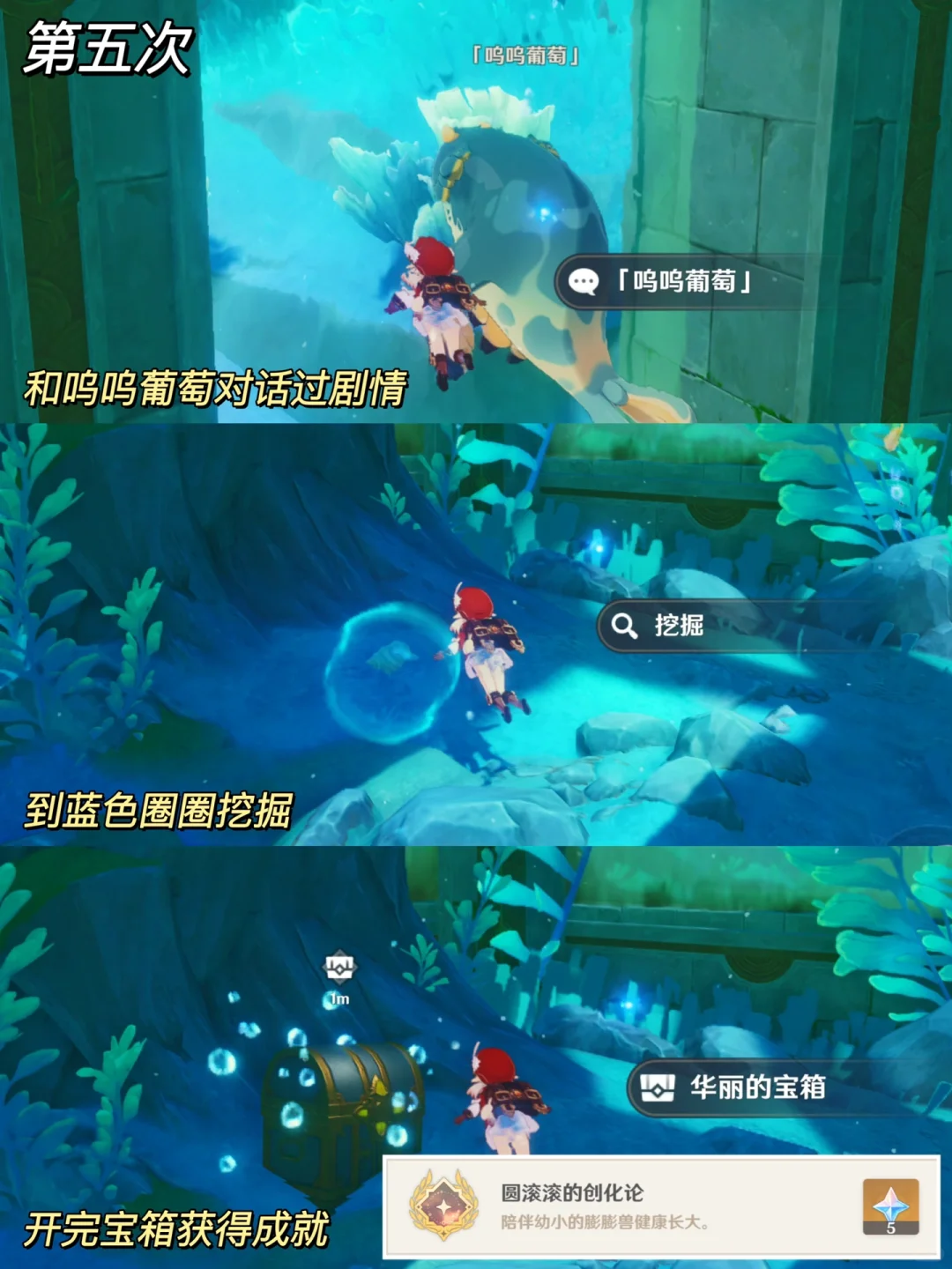 ⏰耗时现实世界最快三天 ✅1个华丽宝箱+1个隐藏成就【圆滚滚的创化论】 ⏭️枫丹海底投喂可爱的膨膨兽呜呜葡萄,一共要去五次,每次需要间隔6小时及以上(现实时间,不是游戏时间)。第五次可以挖掘一个华丽宝箱!