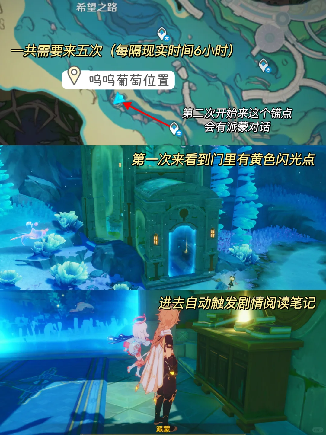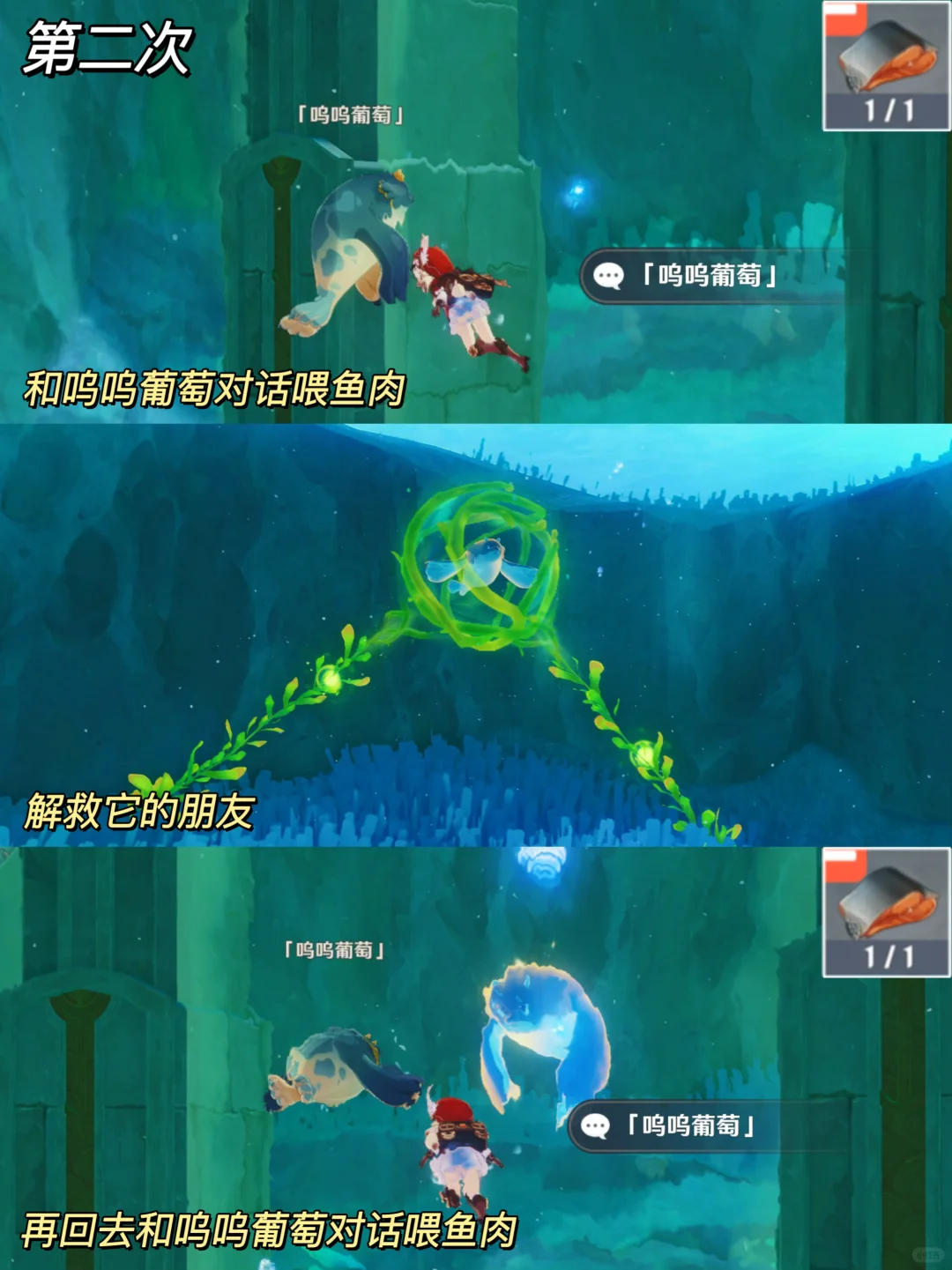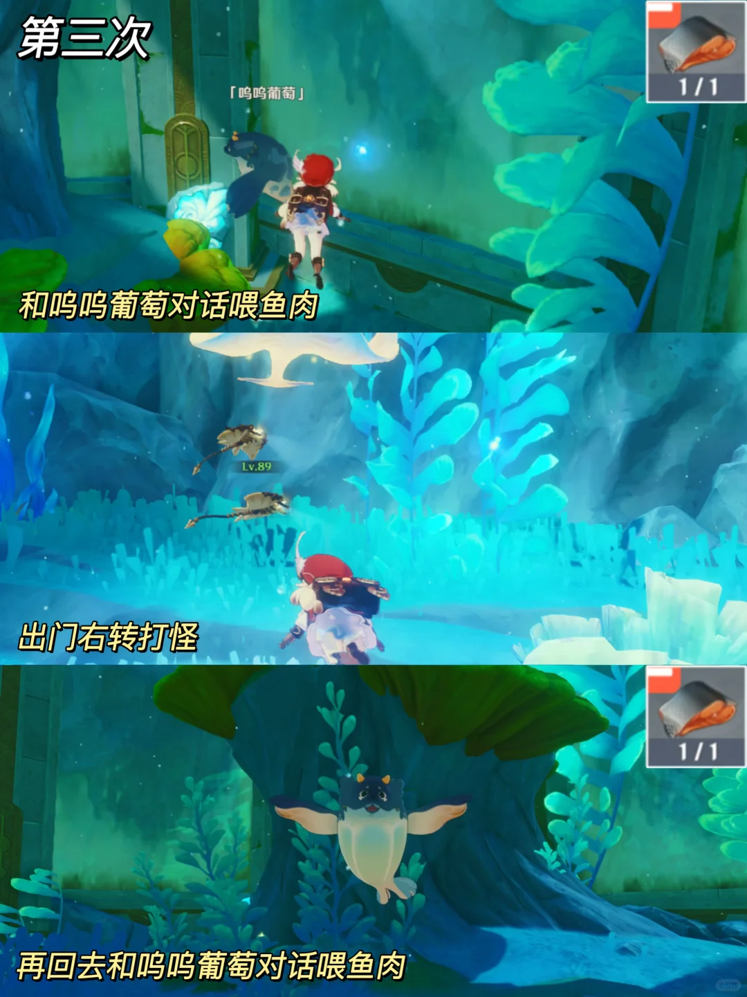 ⏰耗时现实世界最快三天 ✅1个华丽宝箱+1个隐藏成就【圆滚滚的创化论】 ⏭️枫丹海底投喂可爱的膨膨兽呜呜葡萄,一共要去五次,每次需要间隔6小时及以上(现实时间,不是游戏时间)。第五次可以挖掘一个华丽宝箱!