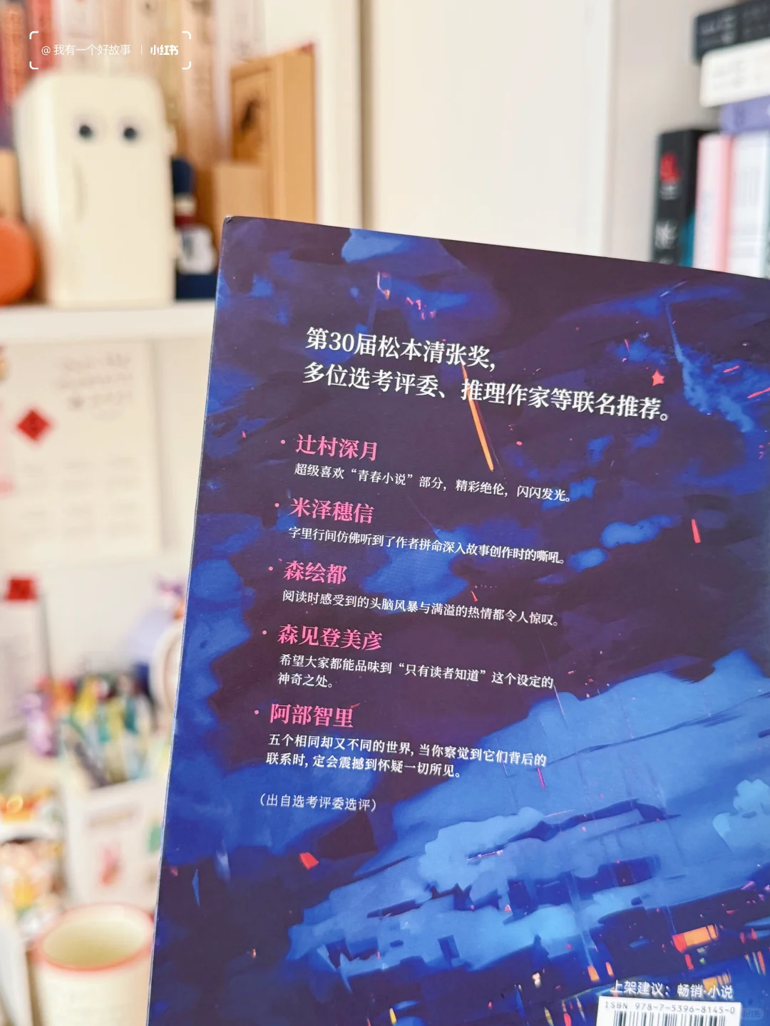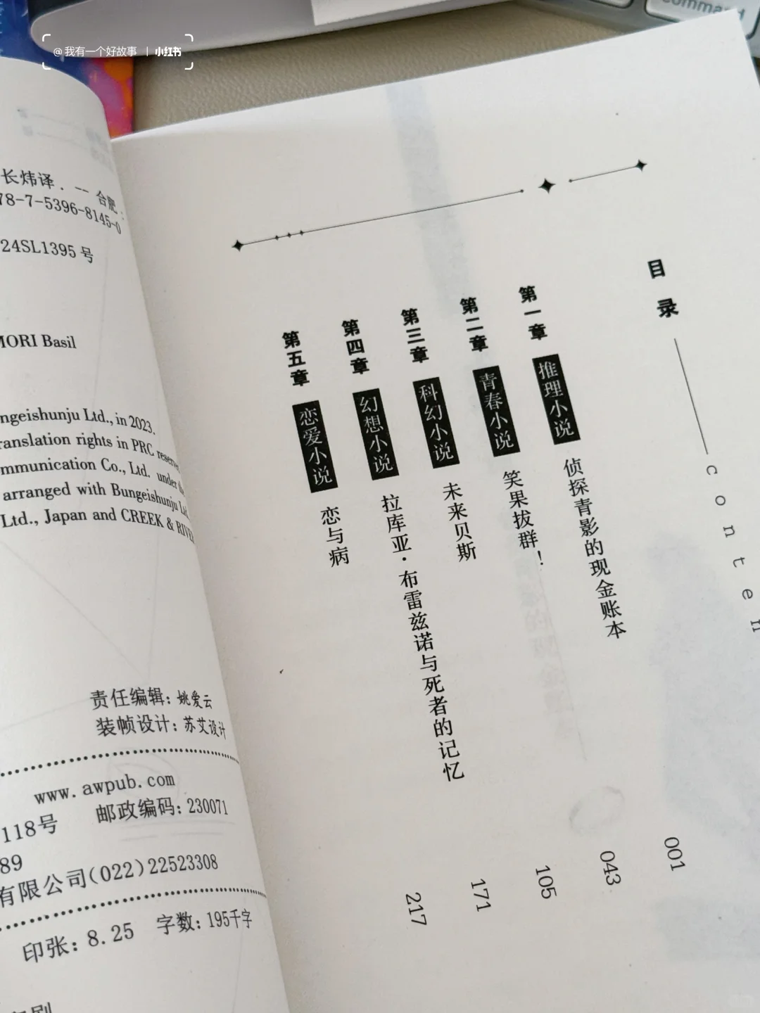 在悬疑新书中搜索时看到了这本书,点进去一下就被牢牢吸引住了,是因为它太有创意!一本书中包含5个短故事,并且每个故事都是不同的题材,推理、青春、科幻、幻想、恋爱,这还不算什么,5个故事里面还有一个串联起来的大线索,只有按顺序读完才能找到!